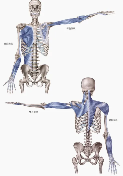 一个有趣的解剖现象是:浅层线(表线)在靠近躯干处是宽大的肌肉,在手臂处变成了窄长的肌间隔;而深层线则相反,在靠近躯干处是较小的肌肉,在手臂处(如肱二/三头肌)却表现得非常发达。这决定了深层控稳定,浅层控爆发的功能逻辑。