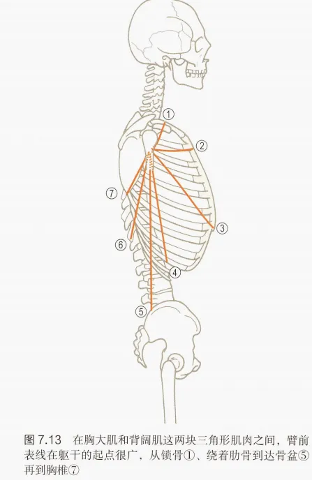 正如鸟儿煽动翅膀向上飞翔,臂后表线负责将双臂从身体侧面拉起。它控制着手臂在中线后方的活动,比如网球中的反手击球。