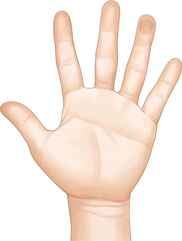 第八条纹路叫作健康线。前面我们讲过一条与健康相关的4线,有那条线的人反而可能不健康,它起于6区(大小鱼际穴之间),指向3区(在无名指和小指的下面)。这条健康线跟前面那条4线不一样,这条健康线反映了一个人的健康状况,有健康线的人代表身体大概率是健康的。如果在1线的上部出现了一条或两条伸向食指或者是中指的纹路,这就叫健康线。