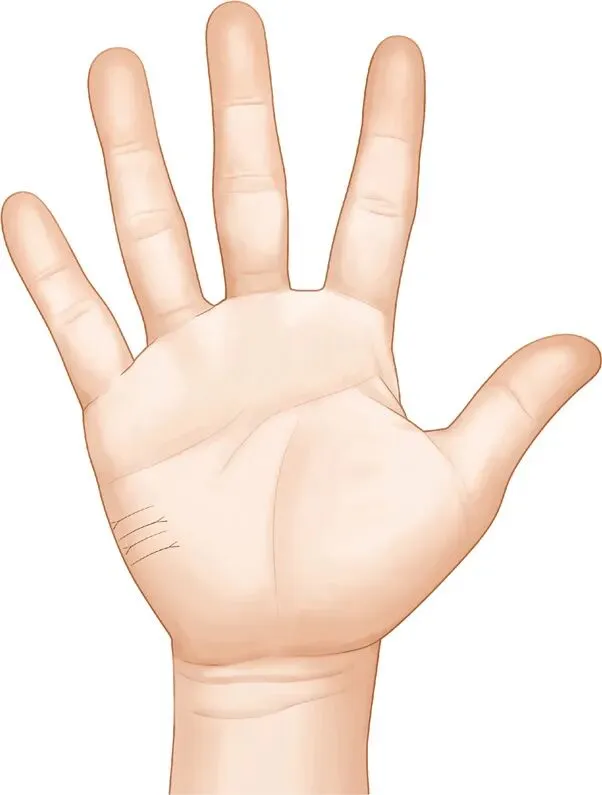 第七条纹路叫作肝分线,又叫作酒线,或许可以表现出一个人的酒量。它是6线的延长线,如果6线特别长,到达了无名指和中指的垂线,这个人的酒量可能还不错。此线如果特别长,那这个人的肝分解酒精的能力可能较强。