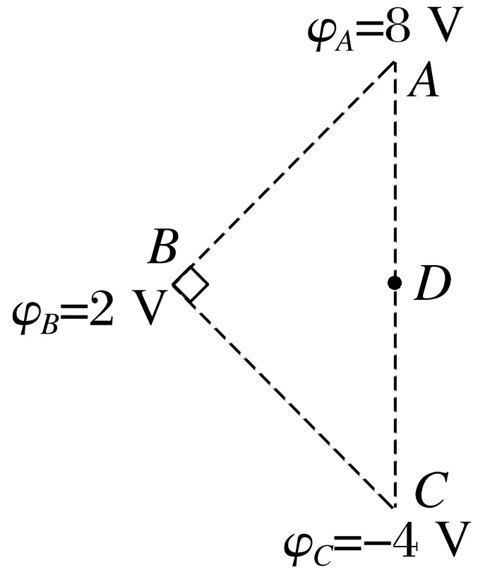 1.(2024·东莞市高二联考)如图所示,在与纸面平行的匀强电场中有A、B、C三个点,其电势分别为8 V、2 V、-4 V,△ABC是等腰直角三角形,斜边AC=2 m,D是AC的中点,则匀强电场的大小与方向是( )
