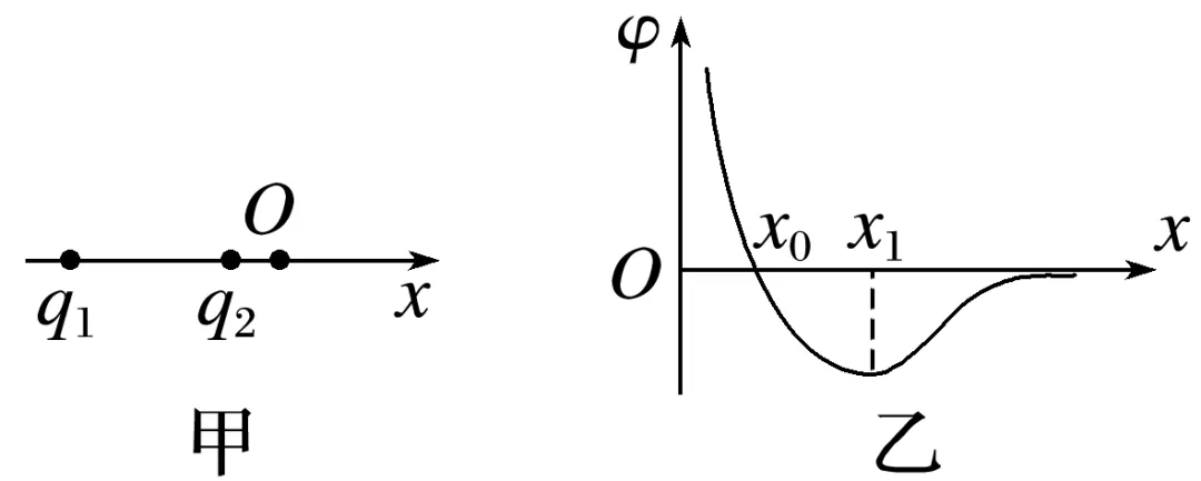 2.(2023·广州市高二期末)如图甲所示,两点电荷q1、q2固定在x轴上,O为坐标原点。在x轴正方向上每一点的电势φ随x变化的关系图像如图乙所示,其中x0处的电势为零,x1处的电势最低。下列说法正确的是( )