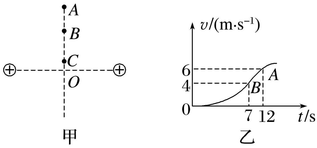 7.(多选)两个等量同种正点电荷固定于光滑水平绝缘桌面上,在水平桌面内两电荷连线中垂线上有A、B、C三点,如图甲所示,一个带电荷量大小为2 C、质量为1 kg的小物块(可看作质点,且不影响点电荷形成的电场)从C点由静止释放,其运动的v-t图像如图乙所示,其中B点处为整条图线切线斜率最大的位置。则下列说法正确的是( )
