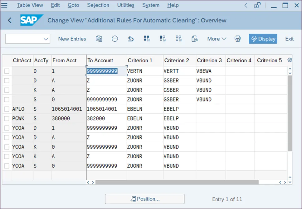如上图所示,你可以配置以下字段:在这个可选字段中,你可以指定这些标准仅对特定的会计科目表有效。账户类型可以是客户、供应商或总账账户。在这个示例中,我们关注的是总账账户的账户类型 S,但在为客户和供应商配置自动清算规则时,也可以使用相同的配置事务。你可以在这些列中最多指定五项标准。自动清算程序将仅清算在所选账户类型和范围下,在这些字段中指定的所有标准都匹配的未清项目。这些标准使用字段的技术名称输入,例如 ZUONR(分配字段)或 GSBER(业务领域)。通常,至少应该使用分配字段,因为通常应清算的项目在该字段中包含相同的信息。根据你的清算要求更新标准,然后保存你的输入内容。你若喜欢,点个❤️谢先👇