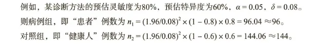 诊断试验样本量大小与以下三个参数有关: ①试验的灵敏度或试验的特异度( p ) ;②试验的检验水准α ; ③容许误差 δ, 一般取值为0.05 ~ 0.10 。