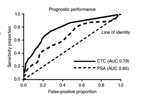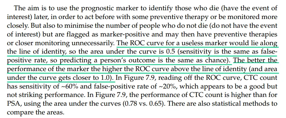 例图摘自A concise guide to clinical trial 临床试验简明指南(好书相伴乃人生一大幸事!),评价CTC(基线时的循环肿瘤细胞)与PSA(前列腺特异性抗原)对于评价前列腺患者预后的有效性,换句话说,就是评价二者哪个更适合作为前列腺癌的预后标志物。