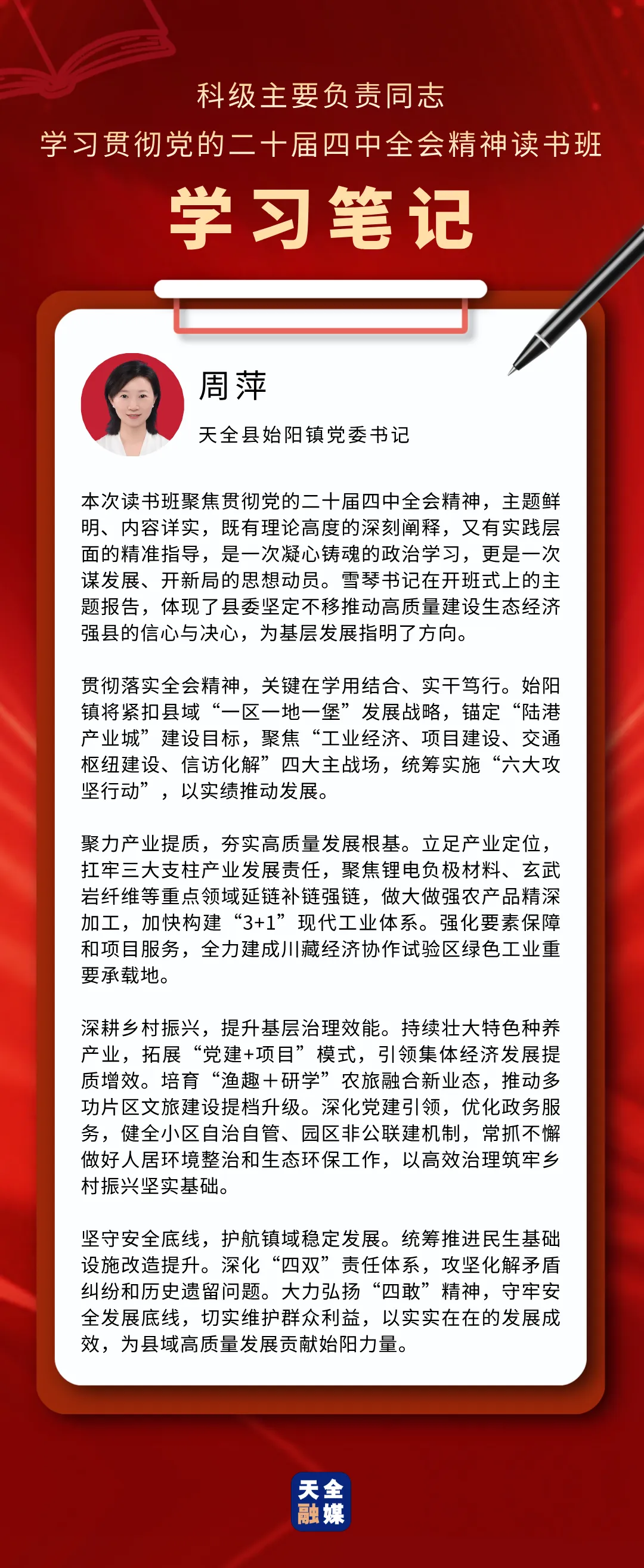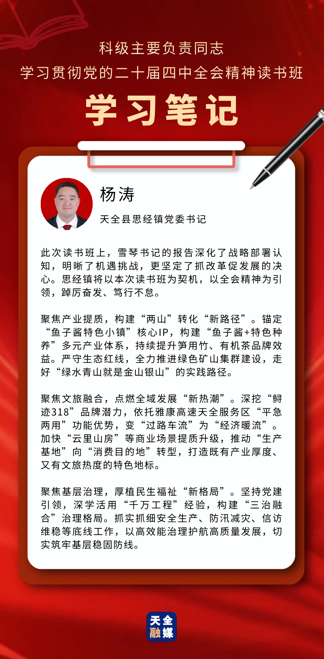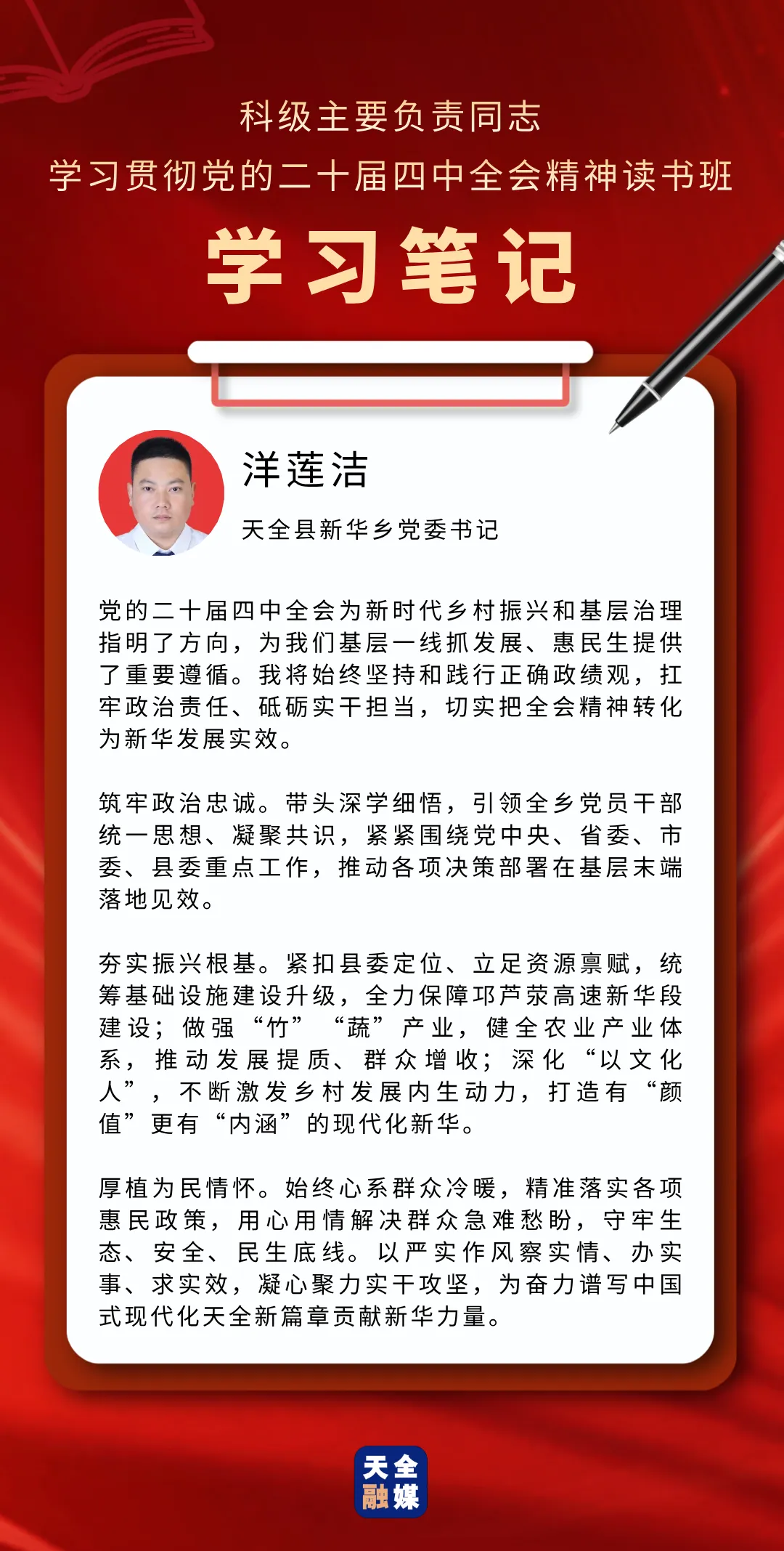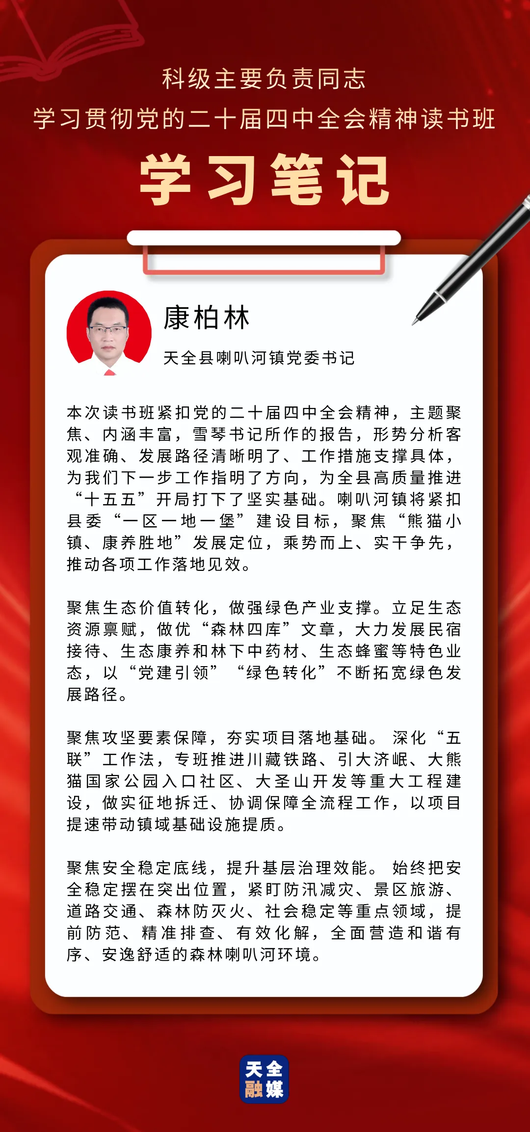 3月22日至25日,天全县科级主要负责同志学习贯彻党的二十届四中全会精神读书班举行。此次读书班,既是对党的二十届四中全会精神的坚定贯彻落实,也是对全县科级主要负责同志进行的一次思想“补钙”、政治“加油”、能力“充电”。通过这次集中学习与研讨,学员们有哪些新感悟、对下一步工作有哪些新谋划?我们一起来看看他们的学习笔记。