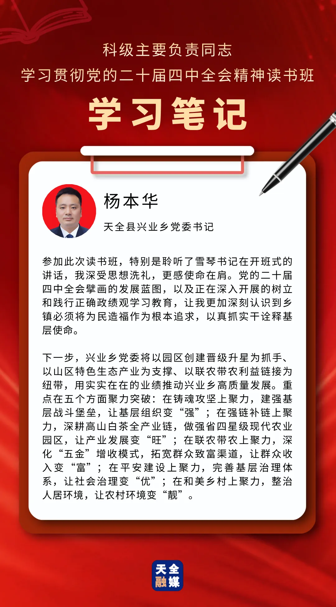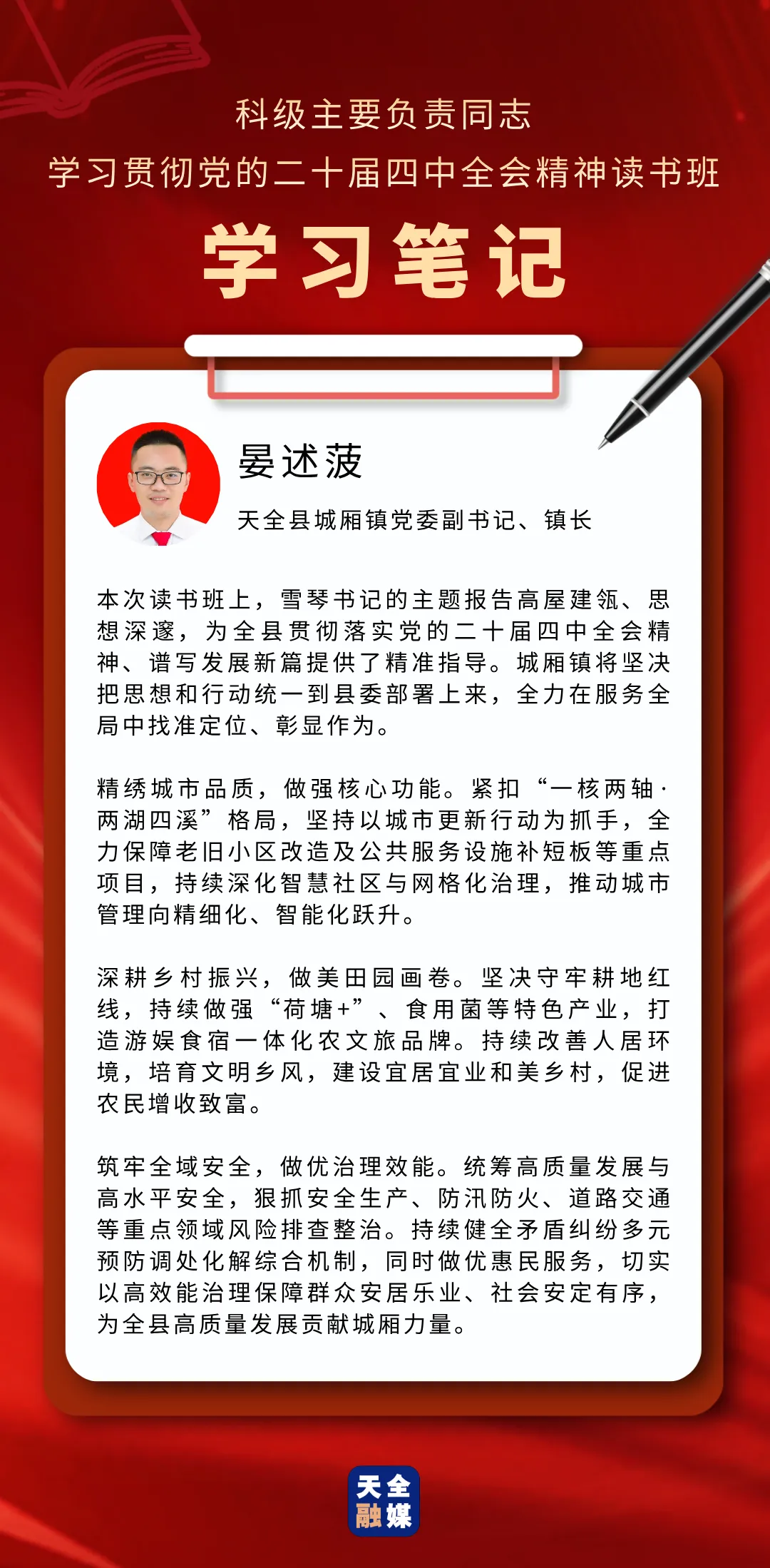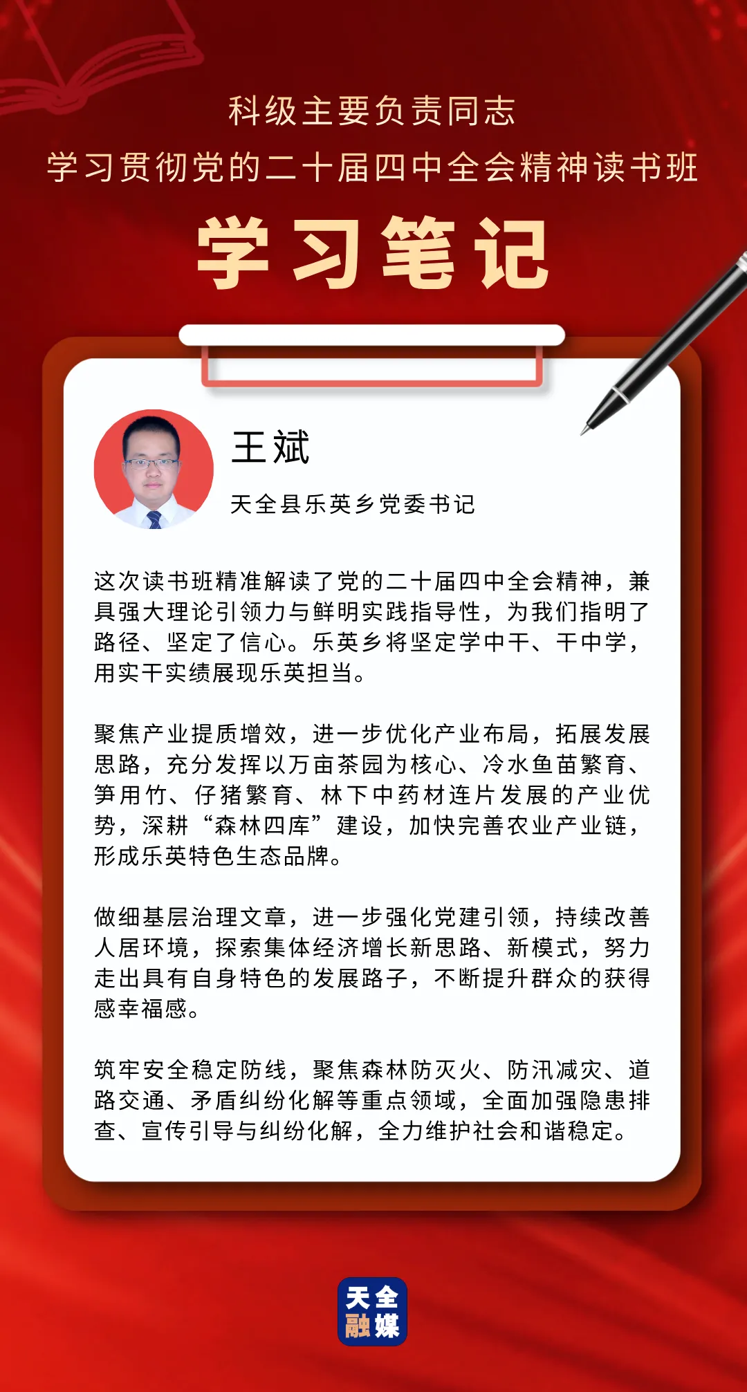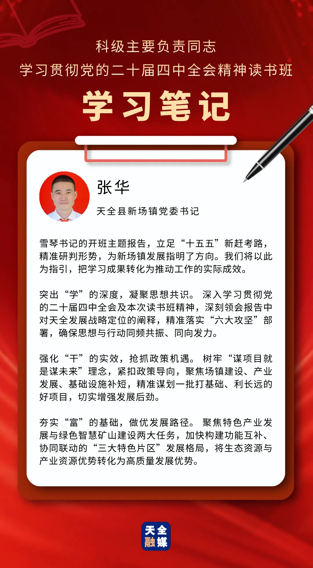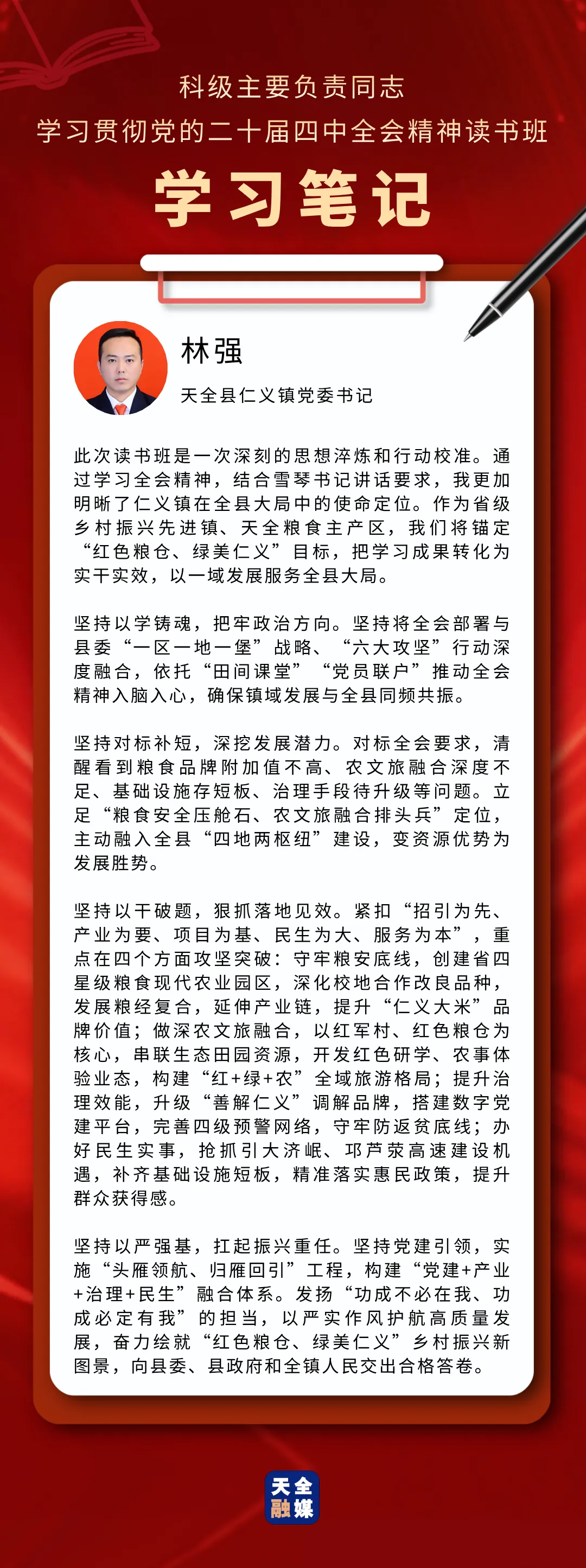 3月22日至25日,天全县科级主要负责同志学习贯彻党的二十届四中全会精神读书班举行。此次读书班,既是对党的二十届四中全会精神的坚定贯彻落实,也是对全县科级主要负责同志进行的一次思想“补钙”、政治“加油”、能力“充电”。通过这次集中学习与研讨,学员们有哪些新感悟、对下一步工作有哪些新谋划?我们一起来看看他们的学习笔记。