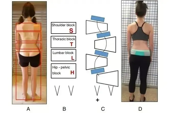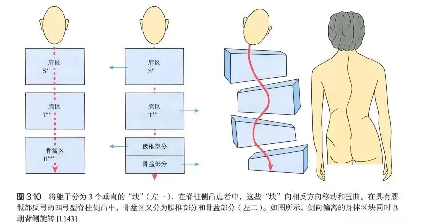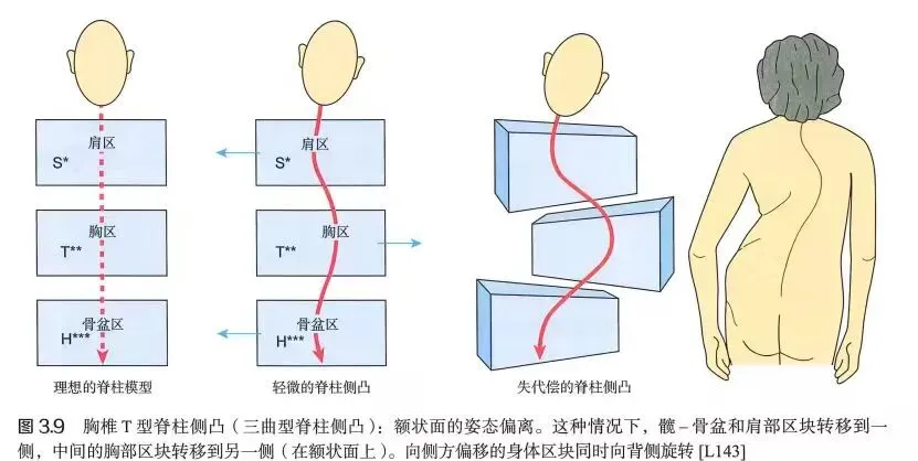 临床表现:躯干向L侧移位,身体重心在L侧,T侧骨盆移位伴髋凸。骨盆在T侧旋转(向背侧),骨盆在T侧抬高,腰凸和腰凹清晰可见,胸部区块和肩部曲块占冠状面和矢状面上,大多对称。