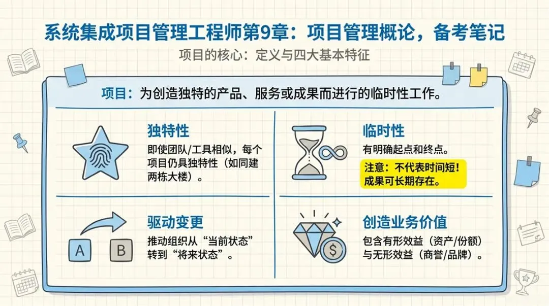 - 项目的四大特征(独特性、临时性、驱动变更、创造业务价值)