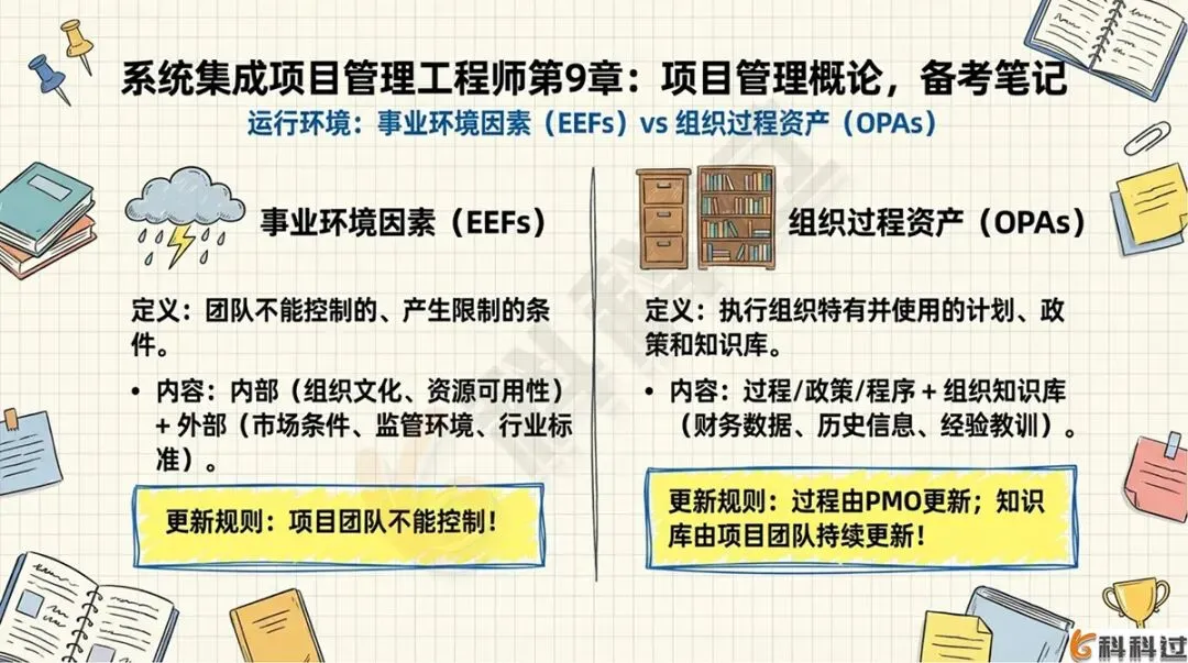 - **事业环境因素(EEFs) vs 组织过程资产(OPAs)**(能否控制是关键区别)