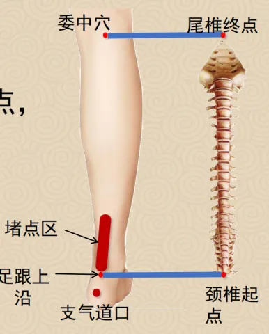 1)小腿全息方法:肩胛骨调理方法——找到小腿颈椎、胸椎段堵点进行标记;点按支气道气道口;点按颈椎、胸椎段堵点;重复以上操作。