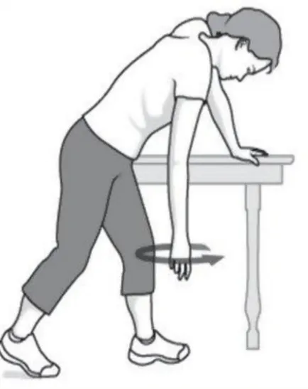 钟摆运动:靠近桌子,身体前倾,健手支撑,患肩放松,手臂像钟摆一样前后、左右、画圈。可以松解僵硬;