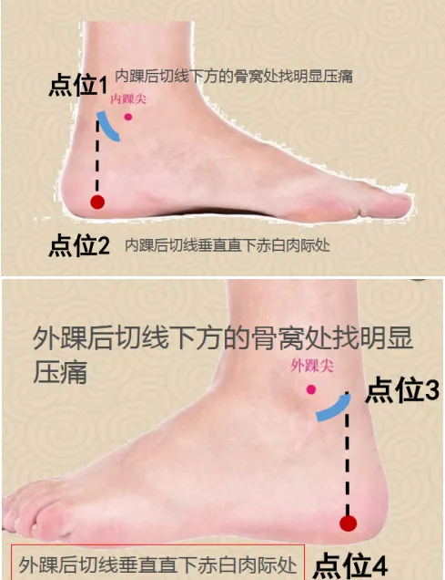 2)足底循环疗法:点位1——内踝后切线下方的骨窝处找明显压痛;点位2——内踝后切线垂直直下赤白肉际处;点位3——外踝后切线下方的骨窝处找明显压痛;点位4——外踝后切线垂直直下赤白肉际处。