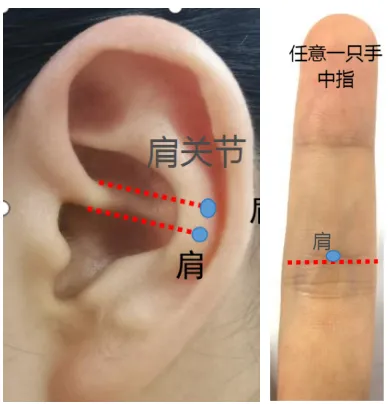 3)耳穴疗法:肩关节——耳轮脚上线水平线向外最顶端耳舟上;肩——耳轮脚下线水平线向外最顶端耳舟上。用手按揉,力度适中,饭前饭后半小时以外都可以点按,感受肩膀的热感和轻松感。