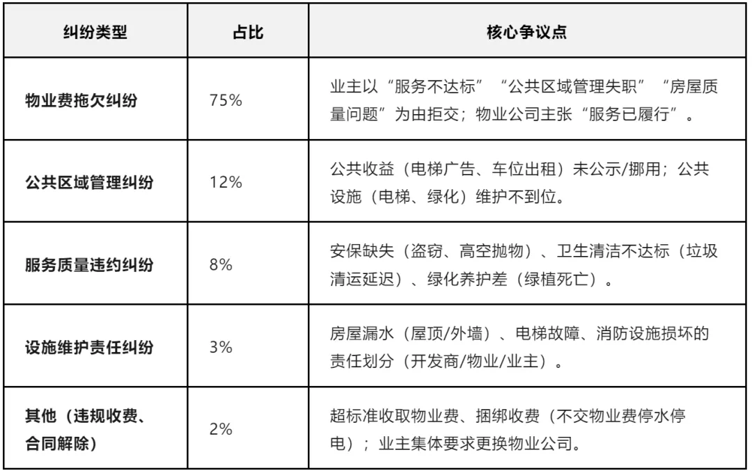 - 物业费纠纷仍为主流,但业主抗辩理由多元化:2018年业主拒交物业费主要以“房屋质量”(占比40%)为主,2023年“服务不达标”(占比65%)“公共收益未公示”(占比30%)成为核心抗辩理由,反映业主从“被动接受”转向“主动监督”。