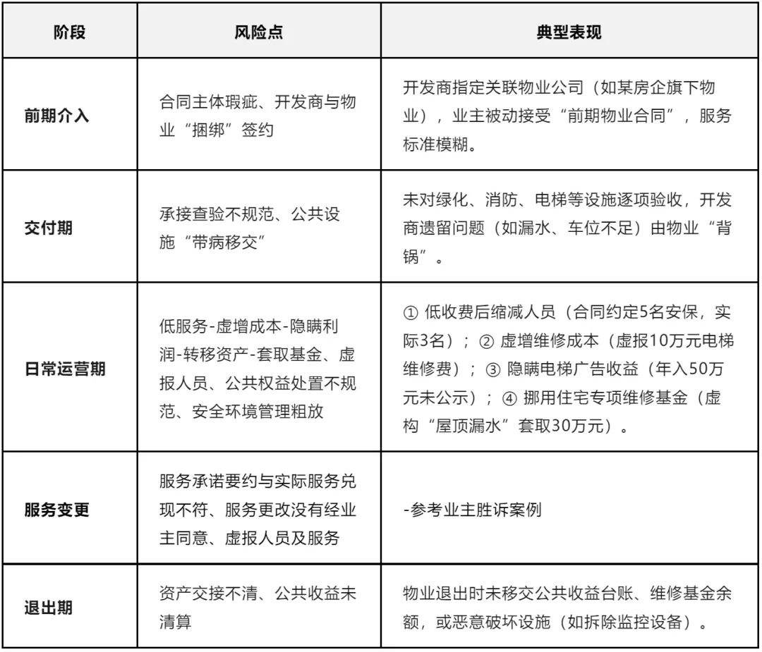 物业全周期管理覆盖**前期介入(规划设计)、交付期(承接查验)、日常运营期(服务提供)、退出期(交接清算)**四大阶段,各阶段存在以下核心风险点,形成“高承诺-低收费-低服务-虚增成本-隐瞒利润-转移资产-套取基金-管理粗放-缺乏监审”的恶性循环。