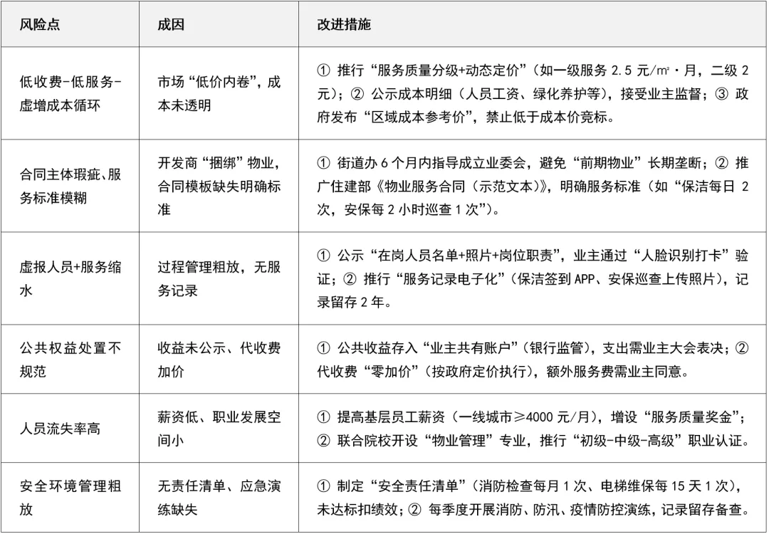 1. 恶性循环的核心是“低价竞争+监管缺失”,需通过“质价挂钩+成本透明”破局;2. 业主参与是长期多赢的关键,需推动业委会成立、公共收益透明、服务评分开放;3. 服务标准化与数字化是提升质量的基础,需制定SOP、引入智慧工具、强化过程记录;4. 人员稳定是服务稳定的保障,需通过“薪资提升+职业发展”增强行业吸引力。