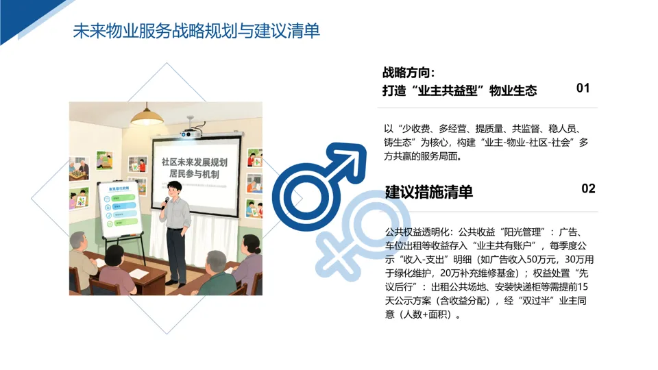 - 推动业委会全覆盖:街道办牵头,小区交付6个月内完成业委会成立,业主通过业委会参与“服务标准制定-公共收益表决-物业考核”;
