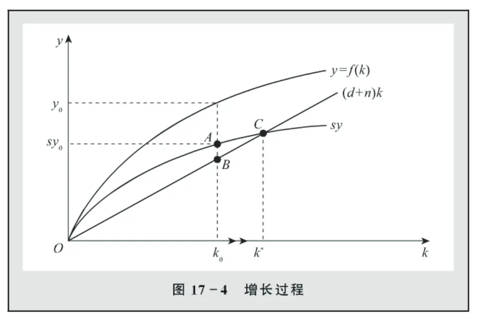 理解新古典增长模型的关键在于当储蓄sy超过为保持资本—劳动比率k不变所需的投资额时,k会上升。相应地,当sy超过(n+d)k 时,k就会上升。例如,如果经济从资本—劳动比率 k₀ 开始,由于在 A 点的储蓄超过在 B 点的为保持 k 不变所需的投资,所以水平箭头显示k值在增加。