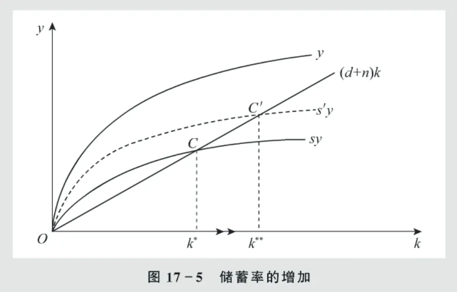 然而在C′点,经济重新回到其稳态增长率n。这样在规模报酬不变的生产函数中,储蓄率的增加在长期中仅仅提高了人均产量和资本水平,而没有提高人均产量增长率。