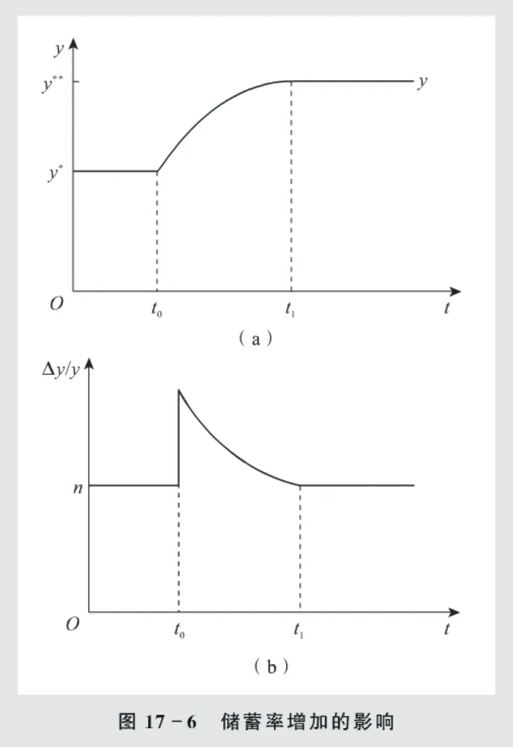 图17-6总结了储蓄率增加的影响。图17-6(a)显示了人均产量水平,从t0时的初始长期均衡出发,储蓄率的增加引起储蓄和投资的增加,人均资本存量增加,人均产量也同样增加。在图17-6(b)中,我们则把目光投向初始稳态中的产量增长率。储蓄率的增加立刻提高了产量的增长率,这是由于资本的更快增长从而引起产量更快增长。随着资本的积累,增长率逐步降低,最终回落到人口增长的水平。