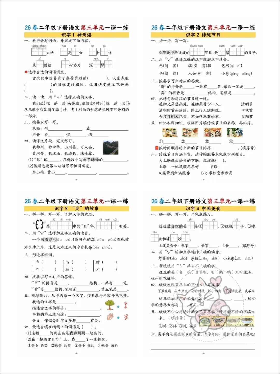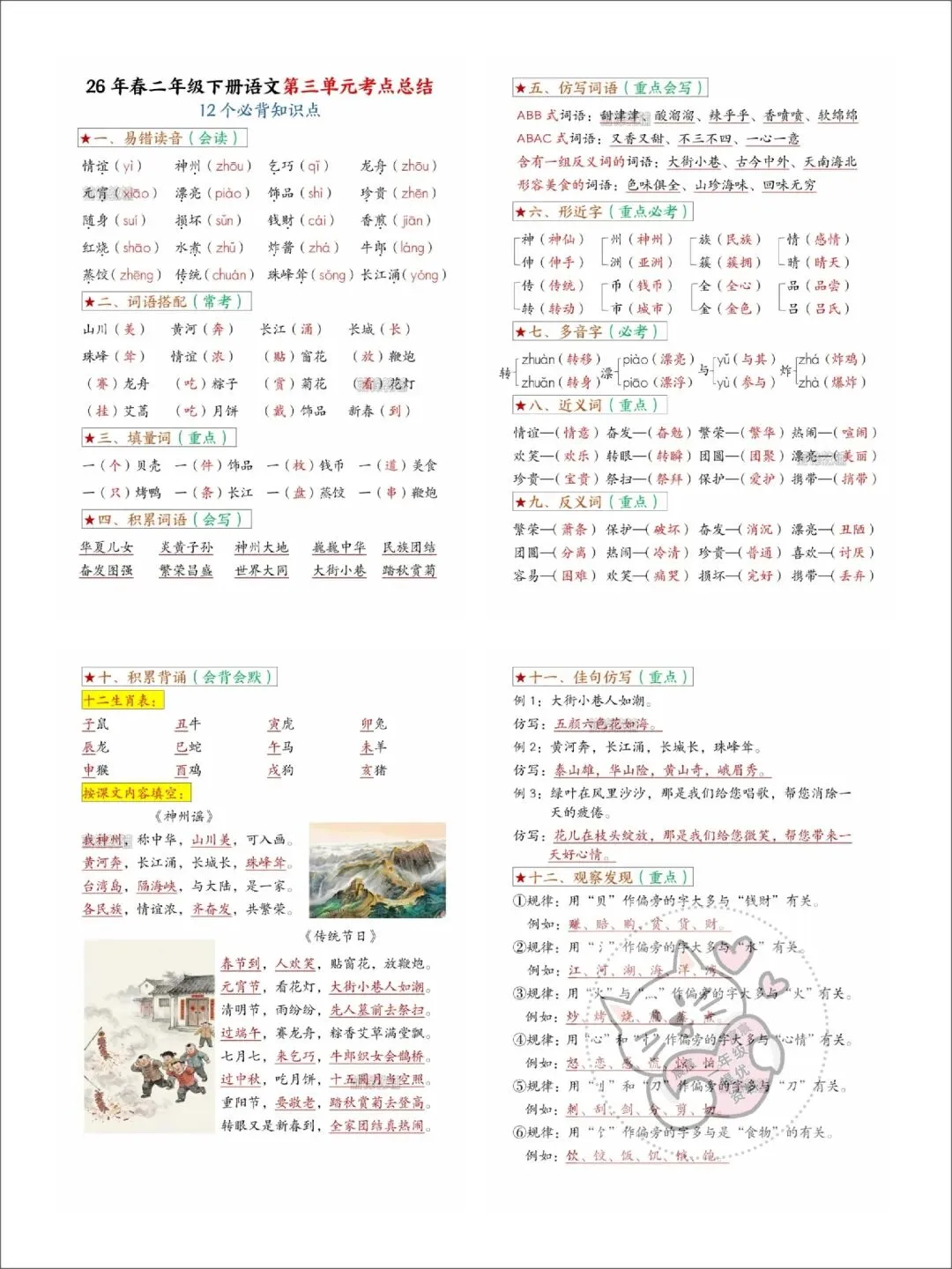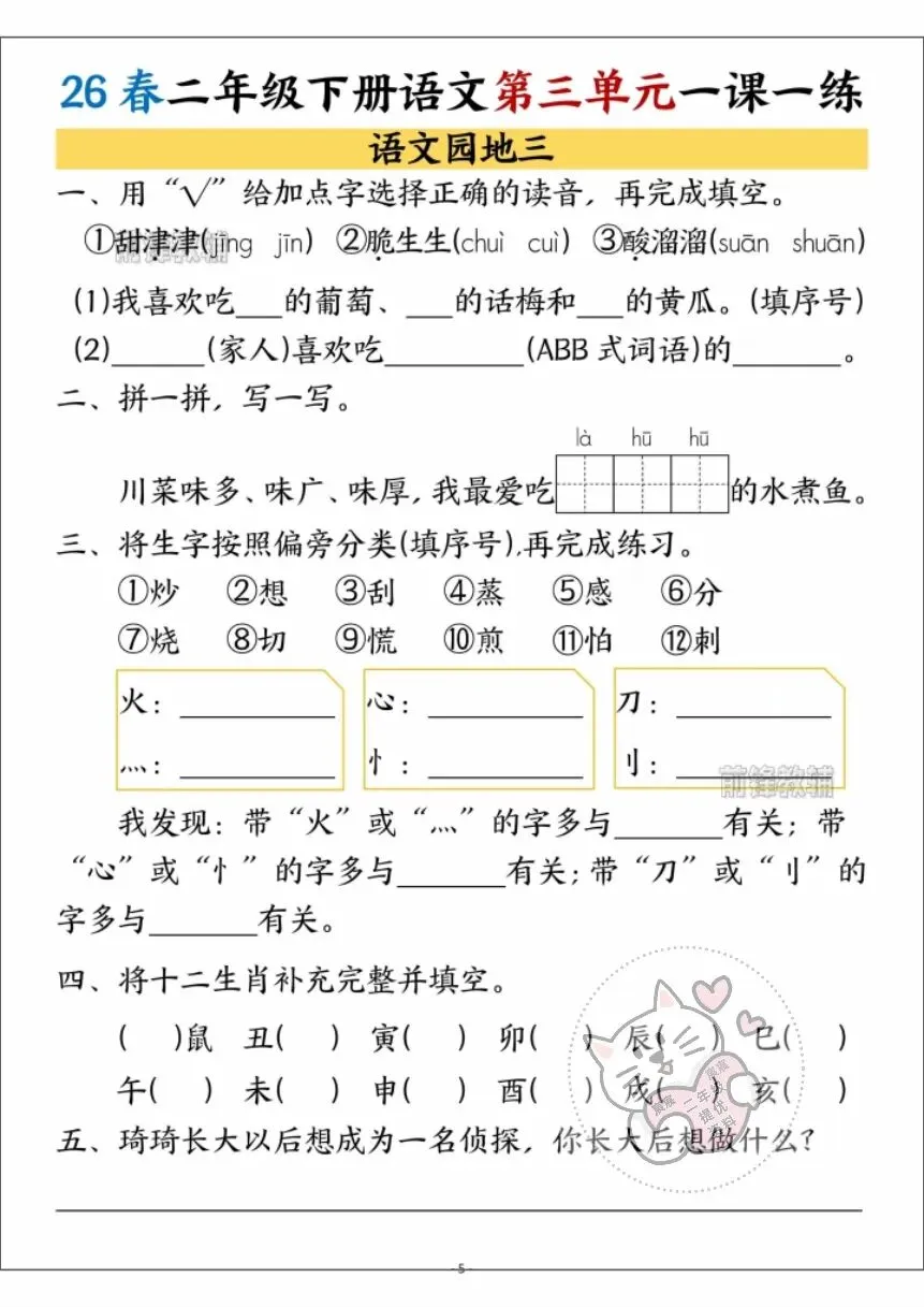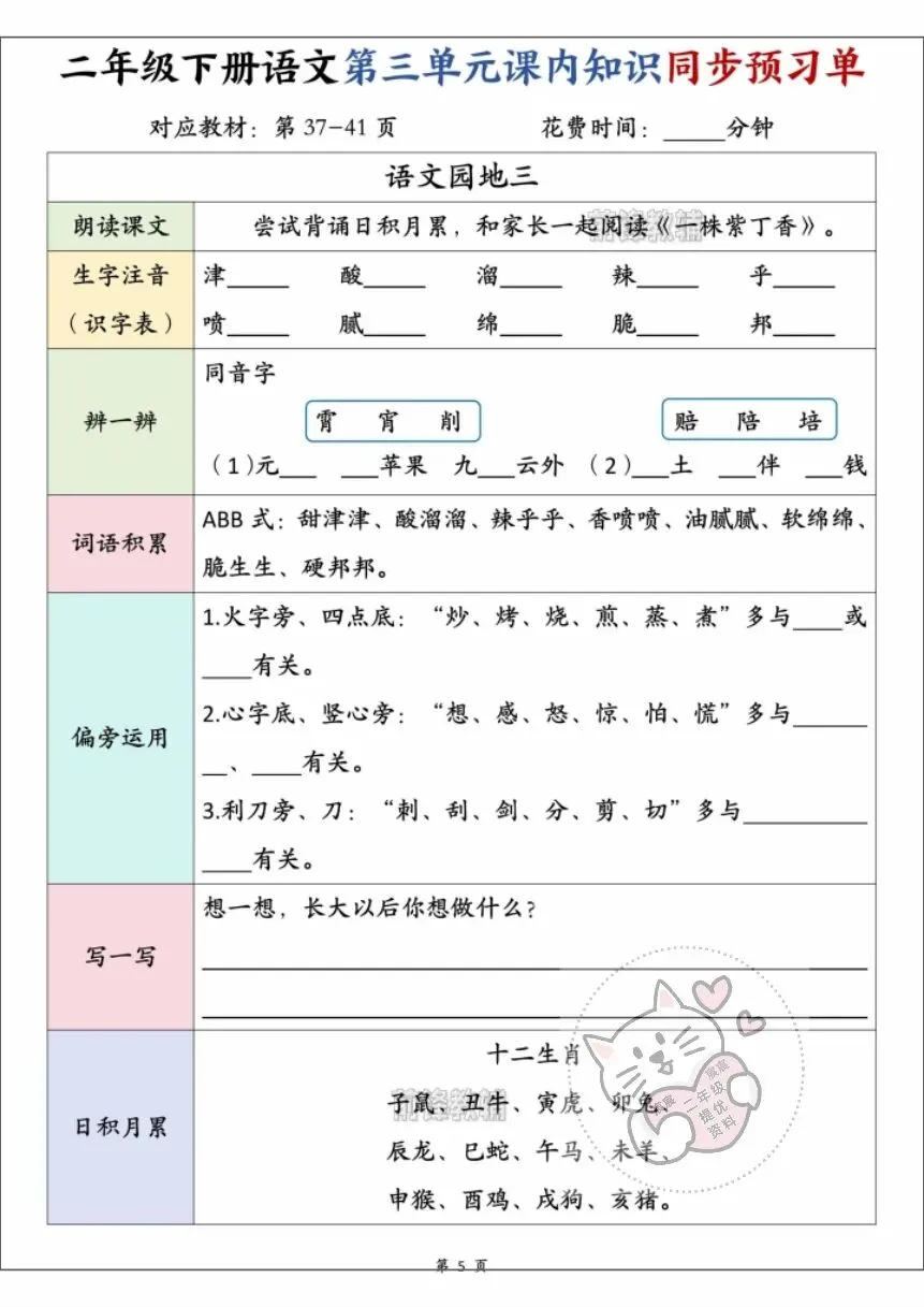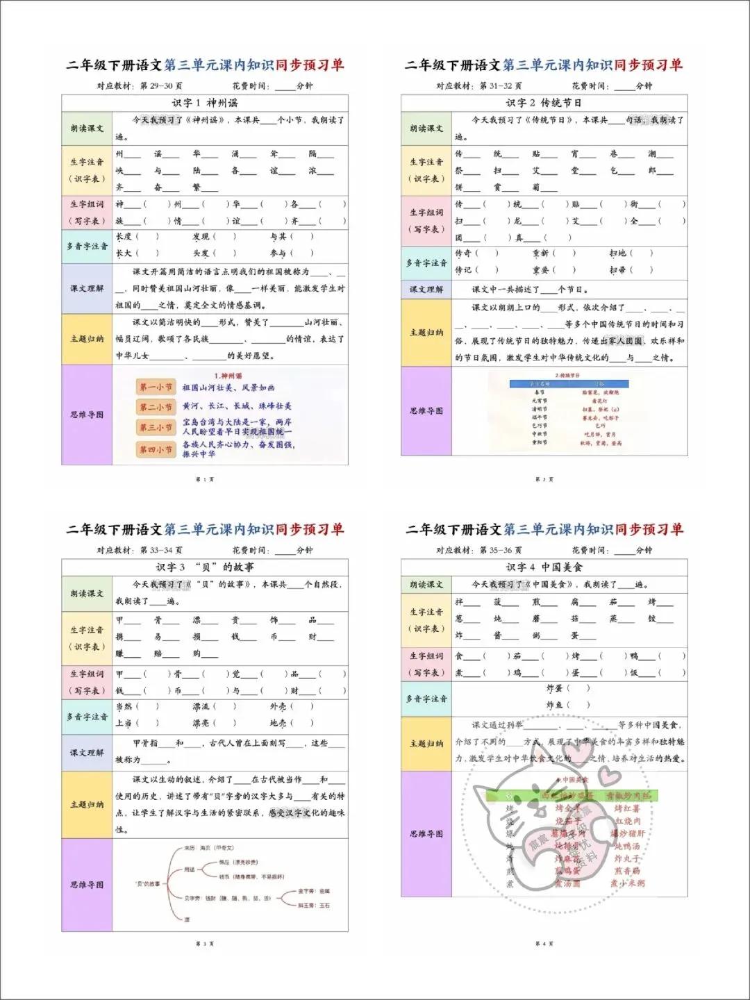 第08期资料分享:二年级下册语文第三单元学习资料(同步课内预习单、一课一练、单元知识点总结)