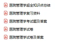 今天分享的资料是「编号-0259-医院管理学」电子版+学习笔记+知识点总结+期末考试重点+复习资料+习题集及答案+名词解释+历年真题试卷及答案+题库及答案+复习重点+思考题及参考答案+公式总结+考试重点基础题+知识总结+高清PDF可打印+免费分享!