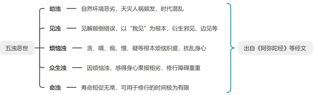 我们在《阿弥陀经》就念到五浊:劫浊、见浊、烦恼浊、众生浊、命浊,这个叫五浊恶世,基本上就是形容一个很脏很恶劣的环境:
