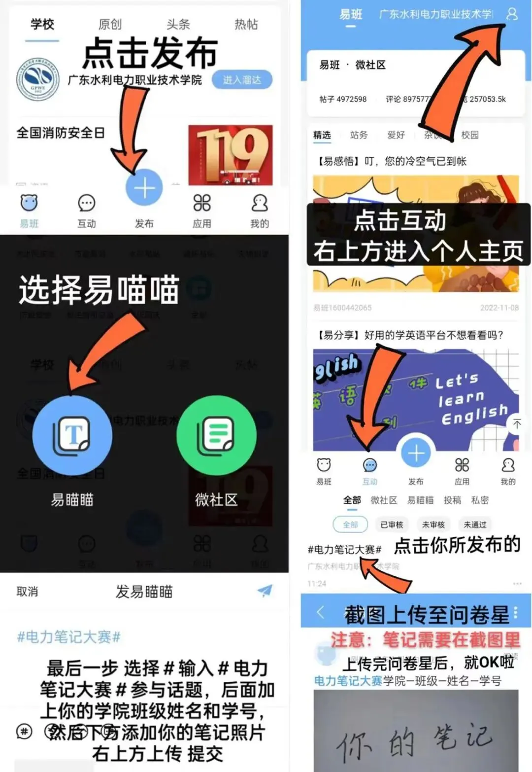 通过手机登录易班app,点击下方菜单栏的发布,点击易喵喵,进行编辑点击#:#电力笔记大赛#的话题中参与,在文本框内填写投稿者的学院(系)、班级、姓名、学号,图片上添加自己拍好的笔记图片,无误后提交作品。