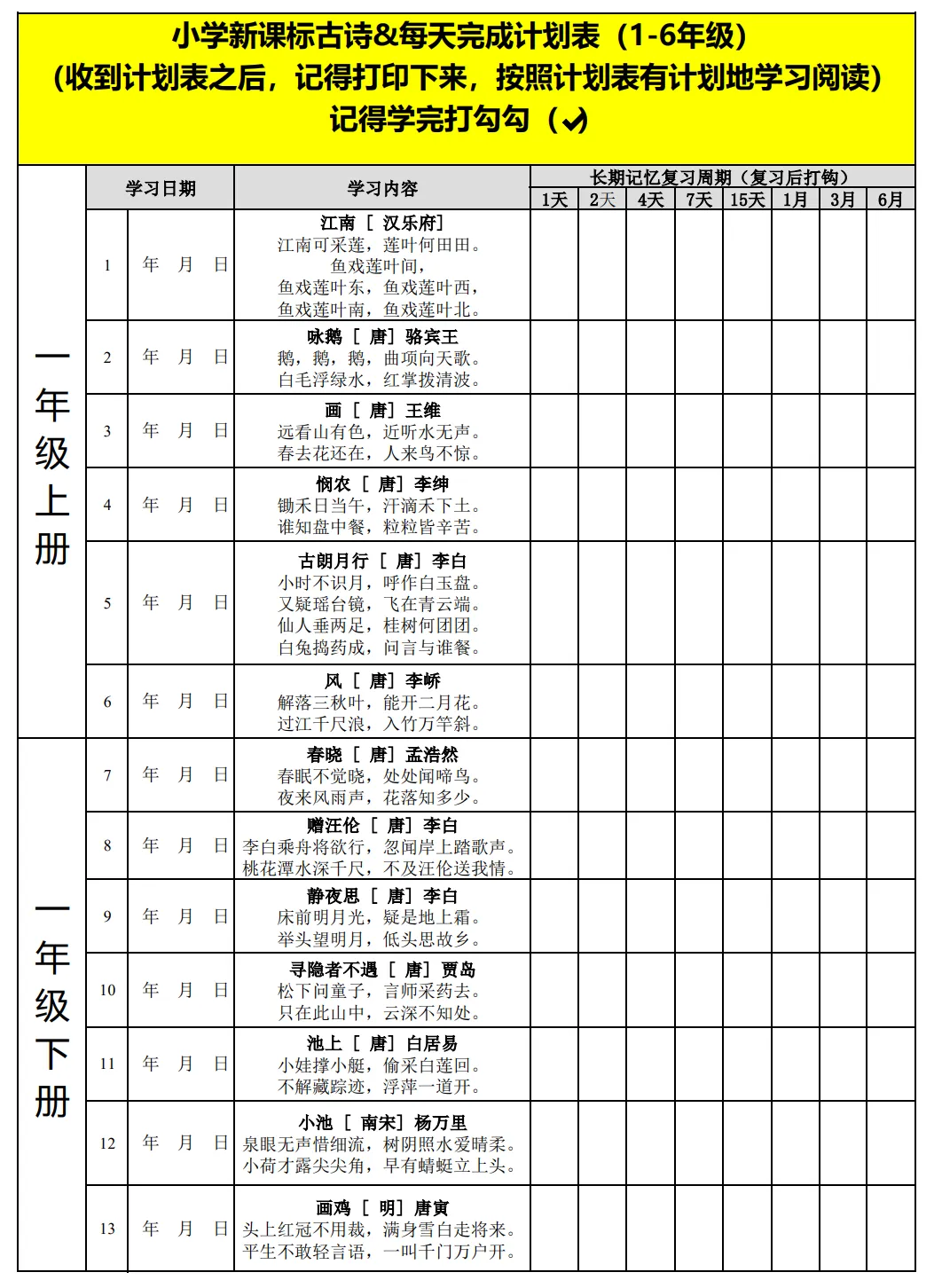 核心亮点是贴合艾宾浩斯遗忘曲线设计,搭配专属学习计划表,从 1 天到 6 月的长期记忆复习周期清晰标注,学完打钩即可,让孩子按计划复习,把古诗牢牢刻进长期记忆。资料完整收录小学 1-6 年级新课标必背古诗,每首诗原文完整呈现,年级划分清晰,从一年级《江南》《咏鹅》到六年级《竹石》《春夜喜雨》,一套覆盖小学全阶段,可打印出来让孩子边学边练,养成自主学习习惯。