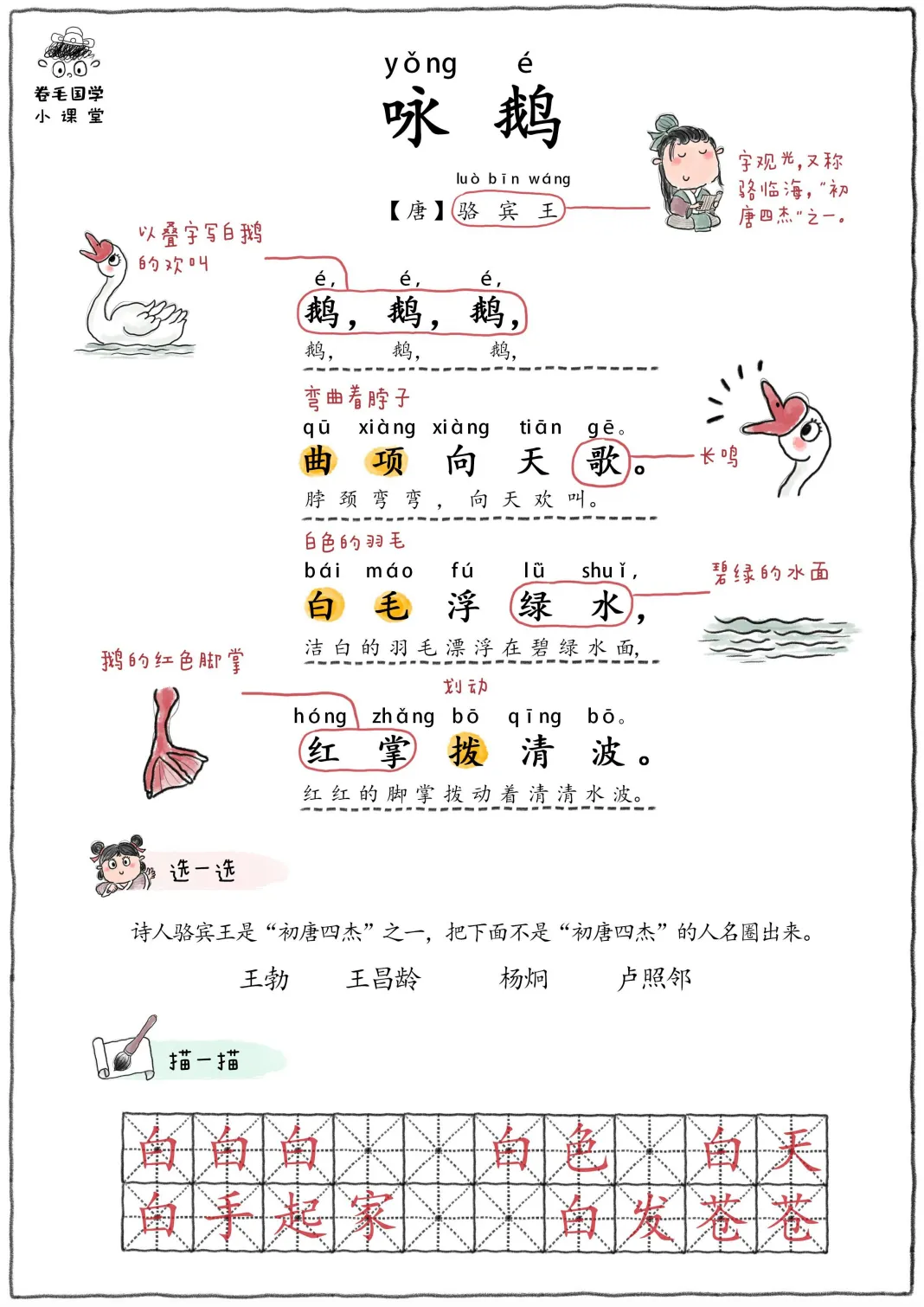 专为一年级孩子量身打造,分上册 5 首、下册 6 首精准匹配教材内容,手绘风格童趣满满,贴合低年级孩子认知特点。每首诗配有完整原文、拼音标注,还有详细的字词解析、诗句释义,把生僻字、重点词讲得明明白白,搭配选一选、描一描等趣味小练习,让孩子边学边练,告别死记硬背。同时补充诗人背景、文学常识,比如 “初唐四杰”“汉乐府” 知识点,从小积累文学素养。