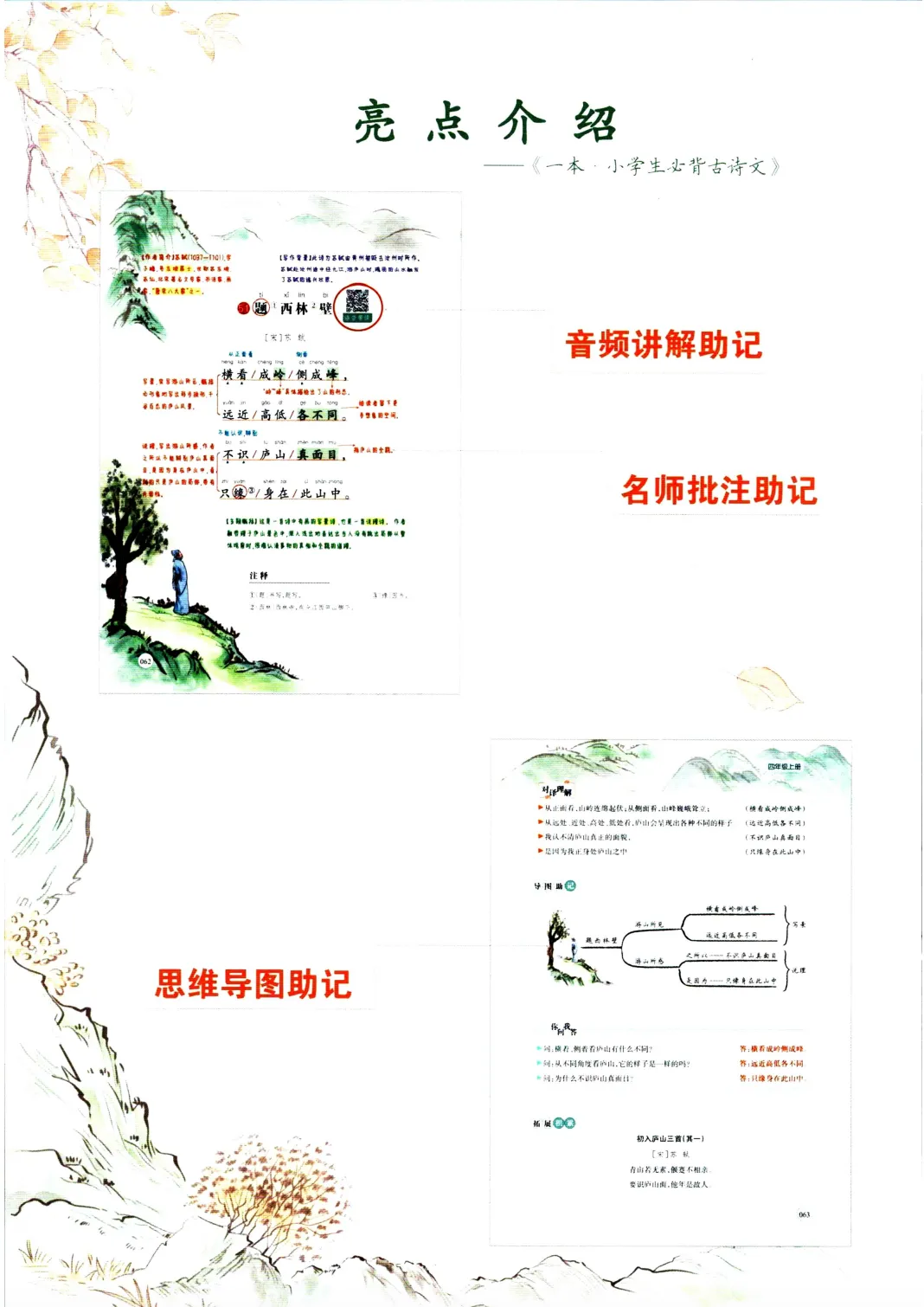 这是一套1-6 年级通学的单本精华版,整册收录小学新课标要求的129篇(首)核心必背古诗文,按年级顺序编排,从一年级入门到六年级进阶,篇目完整、排版清晰,每一篇包含名师批注助词和思维导图助记,内容上保留古诗完整原文,无多余繁杂内容,重点突出,不管是孩子日常晨读、课后背诵,还是家长带娃打卡,都能快速定位篇目,轻便实用。
