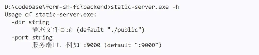 我编译后生成一一个 static-server.exe 文件,加上 -h 参数就可以看到这个消息