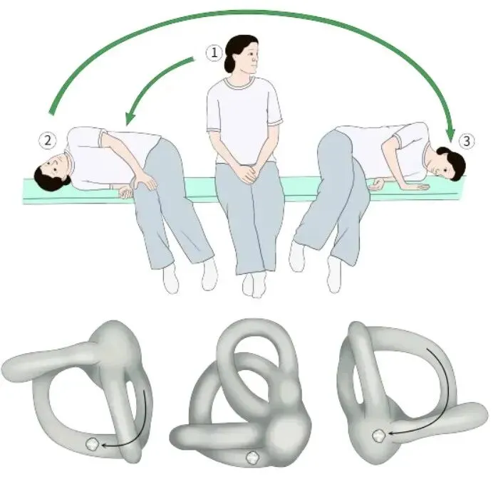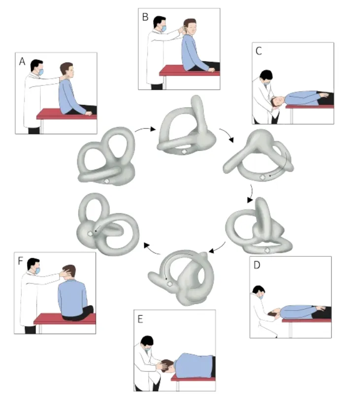 用于向地性眼震患者,步骤:嘱受检者健侧侧卧1~2 分钟,随后头向下旋转 45°,然后扶受检者坐起,保持头向健侧旋转 45°。每步操作保持约 2 分钟。