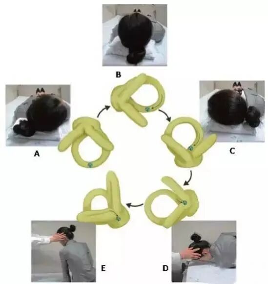 D:保持头与身体的位置不变,嘱患者向健侧翻身90°,此时身体侧卧,头相当于再翻转90°,一共转了270°(注:这一步骤与EPley手法复位类似,但角度不同,且头不用向后悬垂于床平面下30°),E:头位不动,继而坐起。每做一次记一循环,在每一个步骤的维持时间为等眩晕消失后再维持1分钟左右。