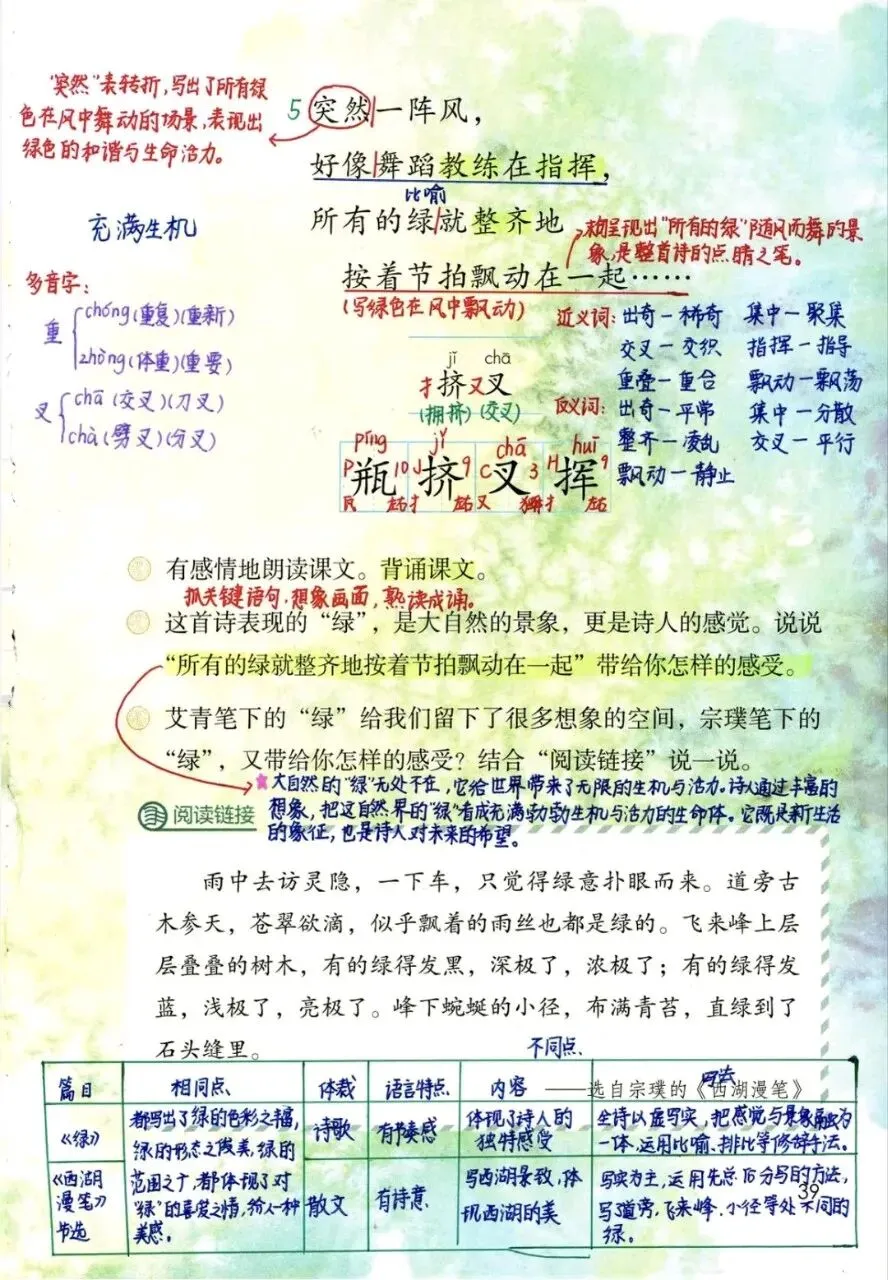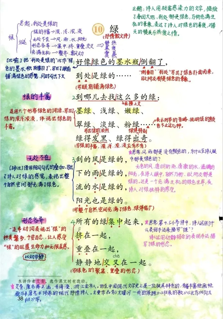 下面分享四年级下册语文第3单元第10课《绿》学习笔记感谢您读到最后,点个“赞”+“在看”,并“分享”给更多人看。