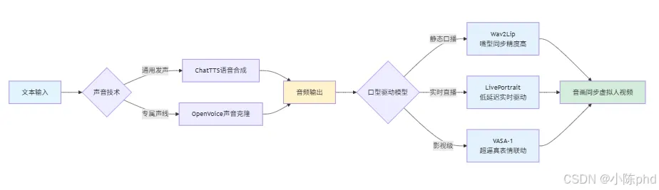 虚拟人的声音表达,最终需要与口型驱动技术联动,实现“音画同步”,让声音与嘴型、表情完美匹配,这是虚拟人拟人化体验的最后一公里。目前主流的口型驱动模型(Wav2Lip、LivePortrait、VASA-1)均支持与TTS/声音克隆的音频联动,核心流程为: