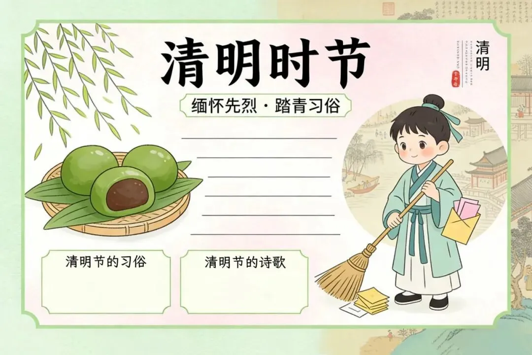 清明节,又称踏青节、行清节、三月节、祭祖节等,在每年4月4日至6日之间,是祭祀、祭祖和扫墓的节日。清明节源自上古时代的祖先信仰与春祭礼俗,兼具自然与人文两大内涵,既是自然节气点,也是传统节日。今年清明节,小编仍给大家准备了各种不同风格的手抄报素材,大家可以自行下载打印哟!