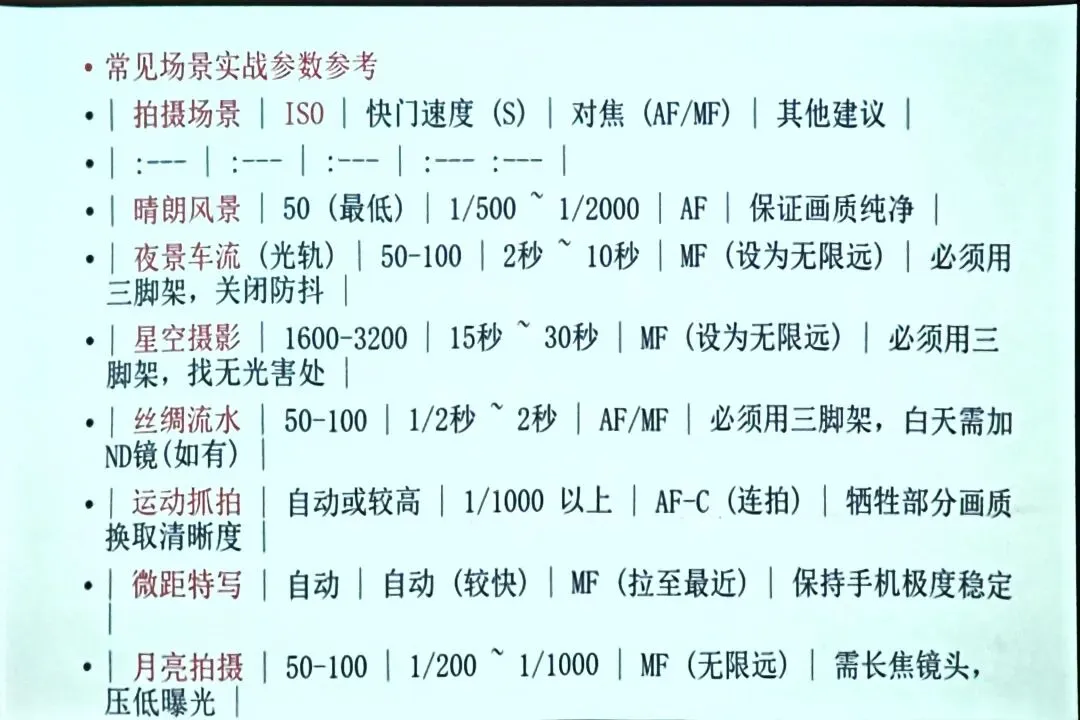 - 技巧:拍风景、静物用慢快门;拍运动的人、宠物、车流,用高速快门,避免画面模糊。