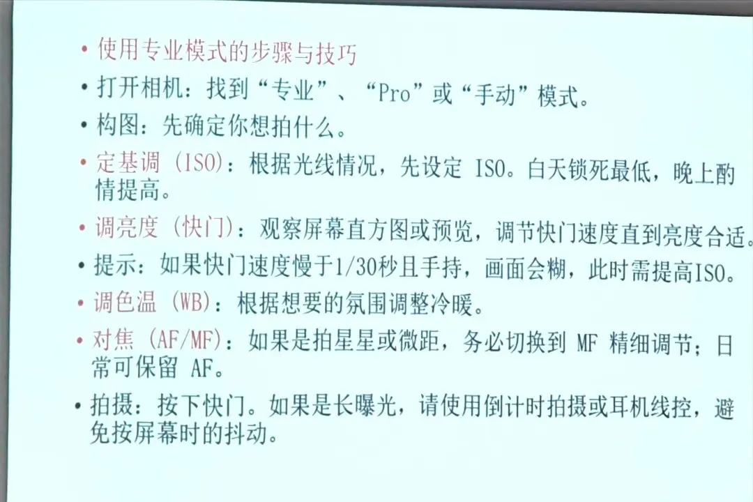 也发现班里同学的手机型号、版本参差不齐,不同品牌手机的专业模式入口、设置方式都不一样,学习起来需要灵活适配。老师还提醒后续要带笔记本电脑,用于照片后期处理。