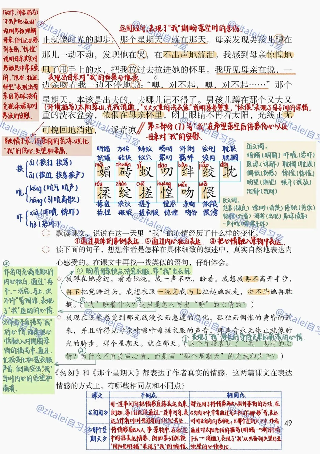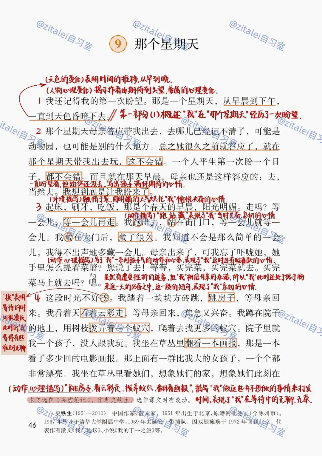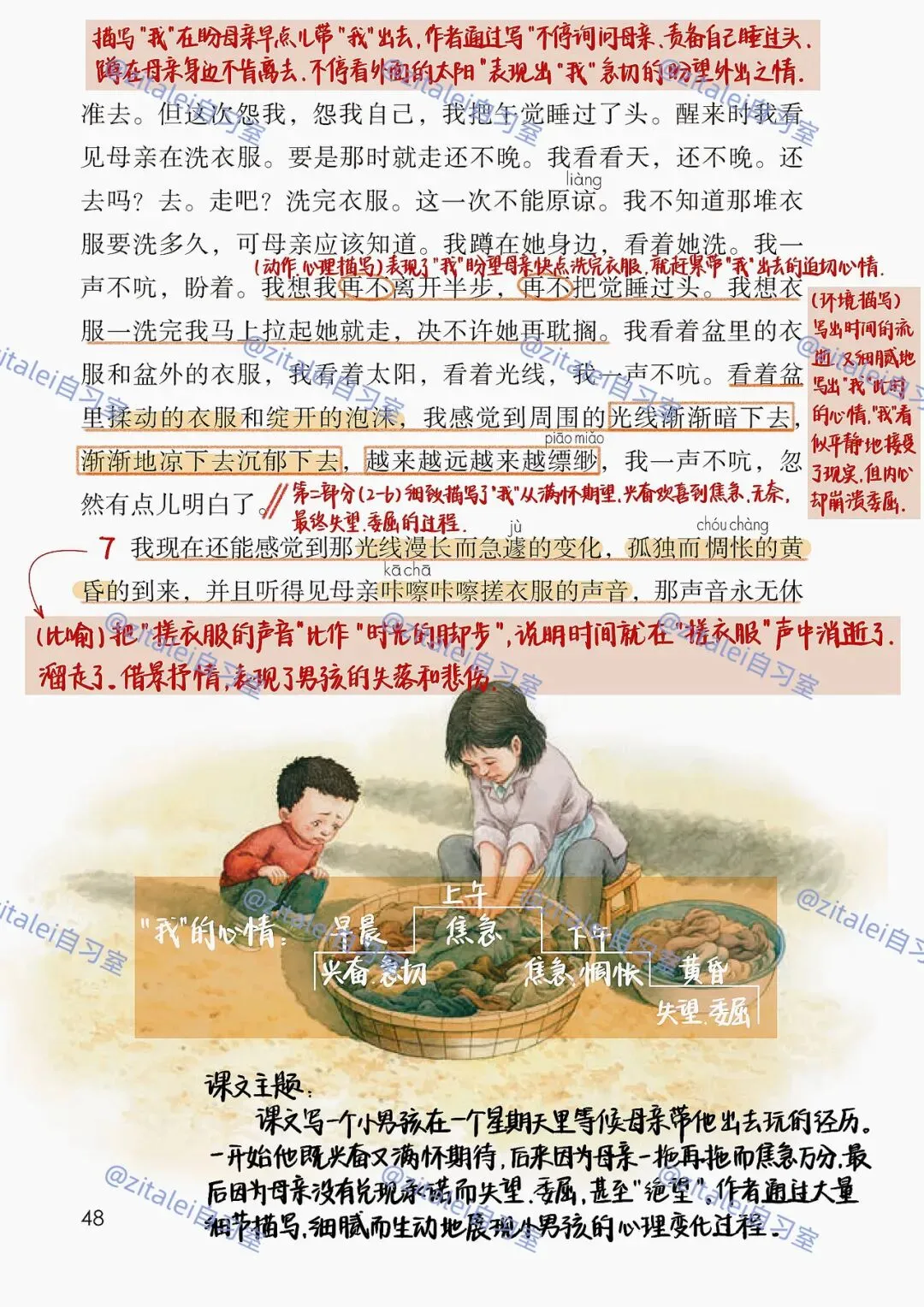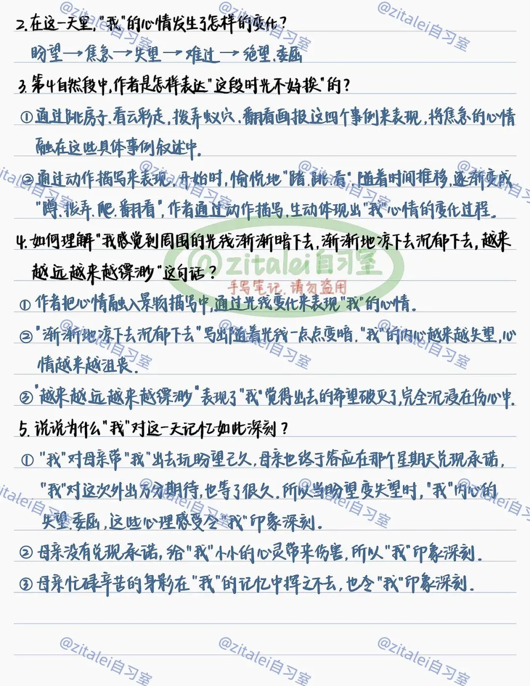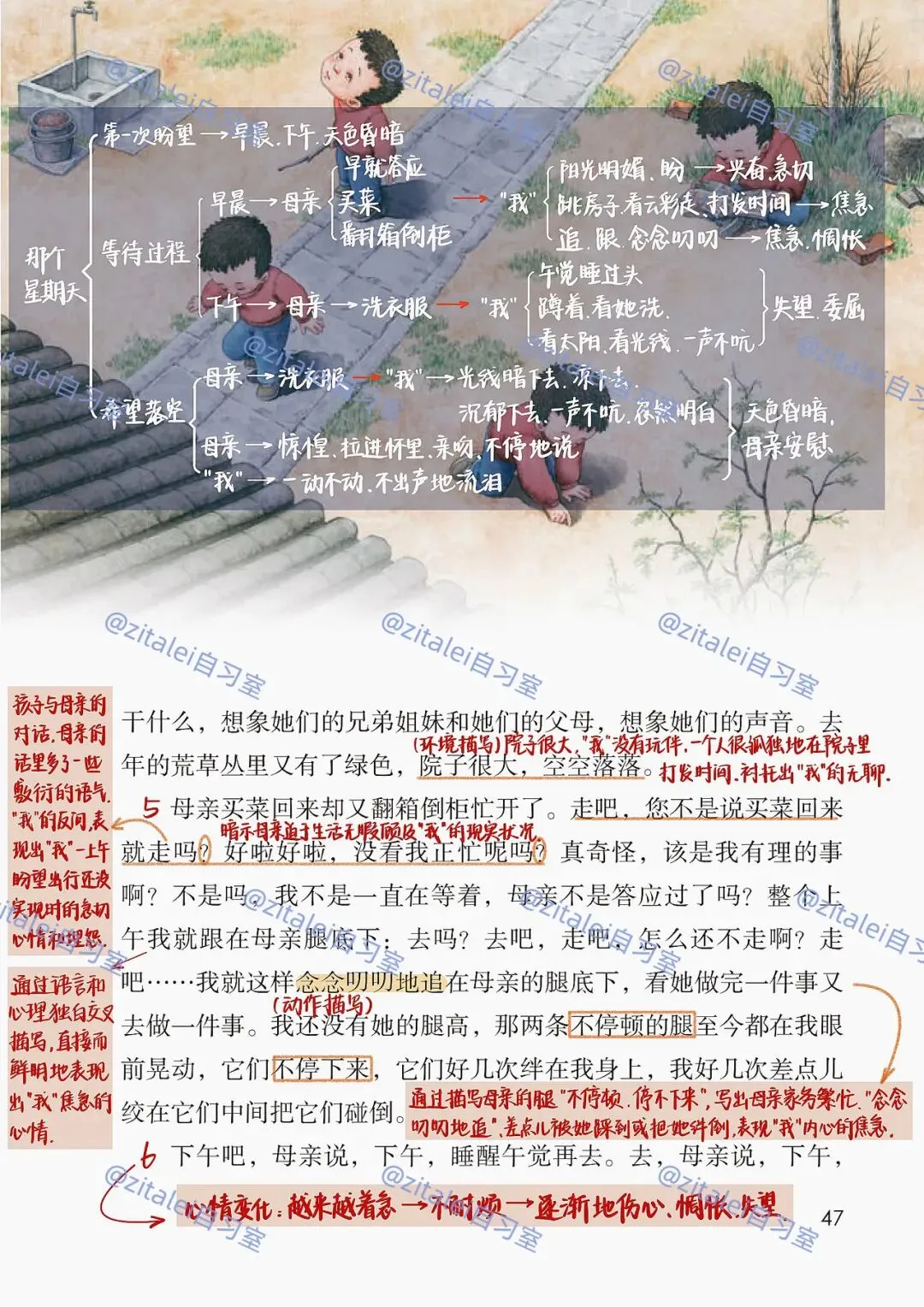 1. 把握文章时间线索(早晨→下午→黄昏)与情感暗线(期待→兴奋→焦急→失望→委屈)。