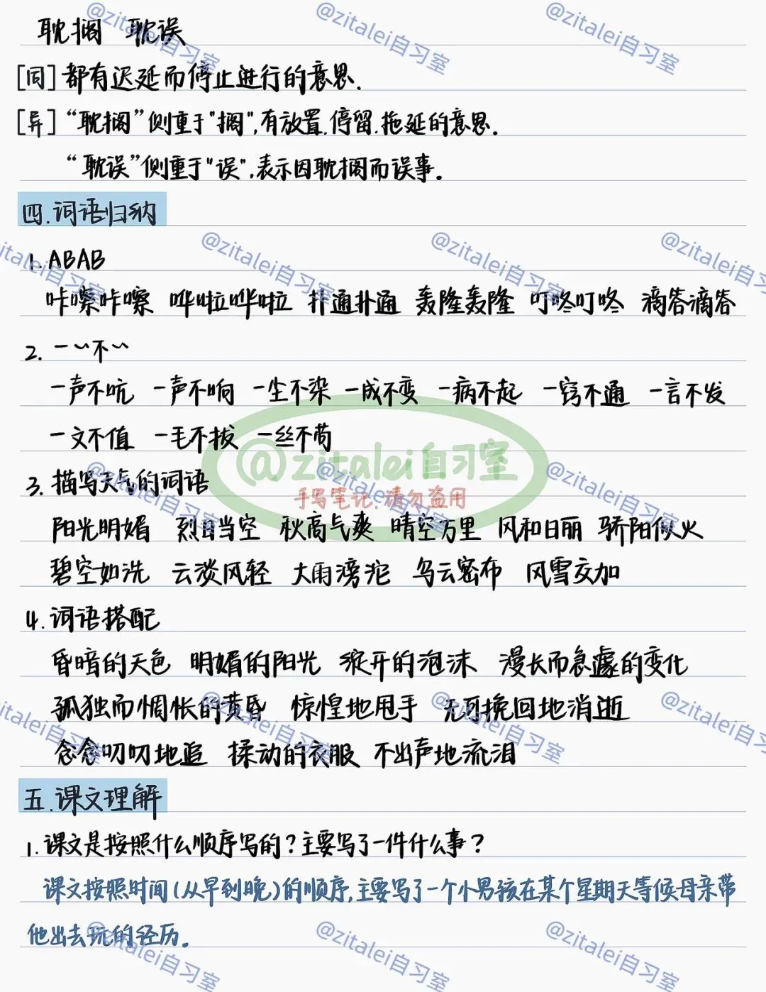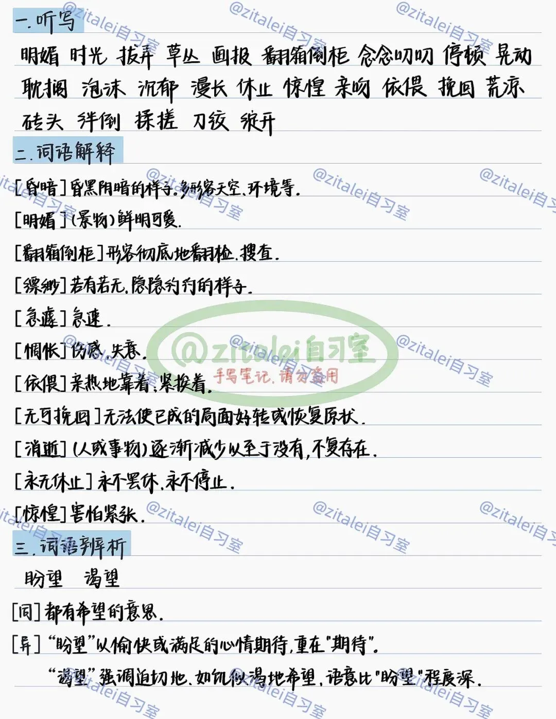 ❷易错词:明媚、耽搁、沉郁、依偎、翻箱倒柜