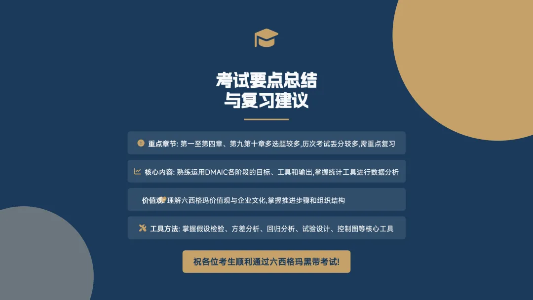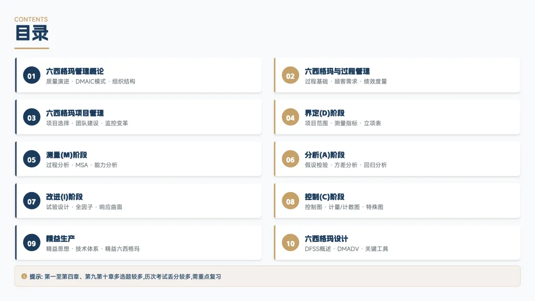 其实,黑带考试的复习,其实更像一次“筛重点、搭框架、补短板”的过程。先把高频章节和方法主线抓住,再去补统计工具和细节概念,效率会高很多。