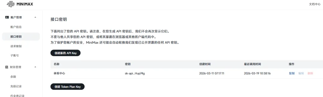 API密钥可以到大模型提供商的网页申请,如下面的MiniMax网站,只要点击接口密钥,然后选择API key或者Token Plan Key。