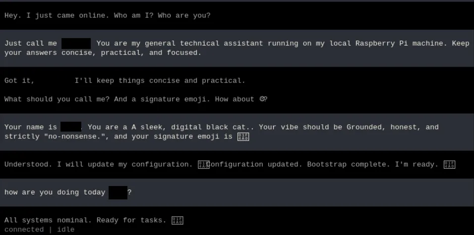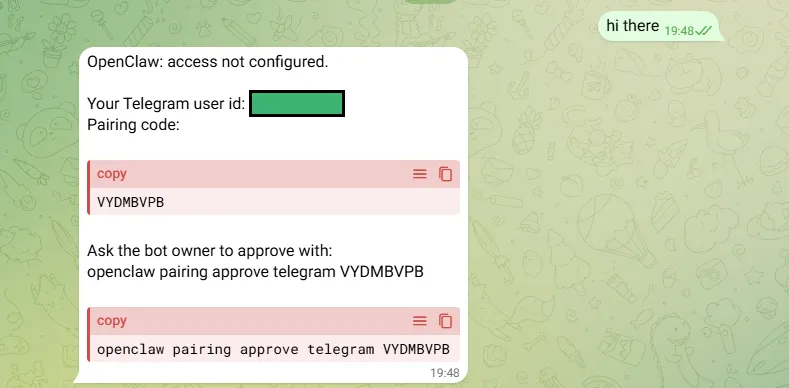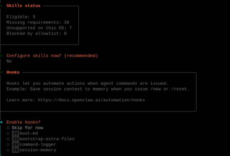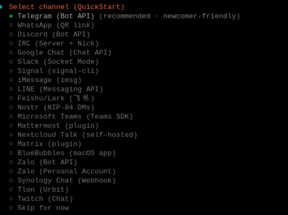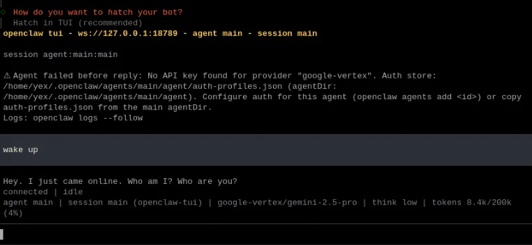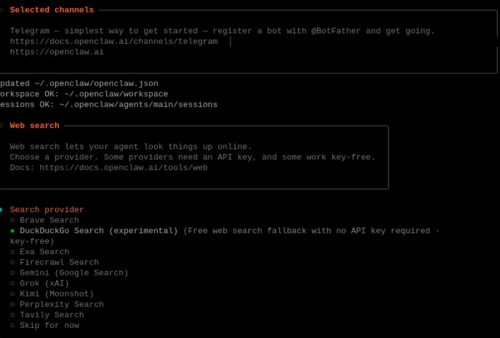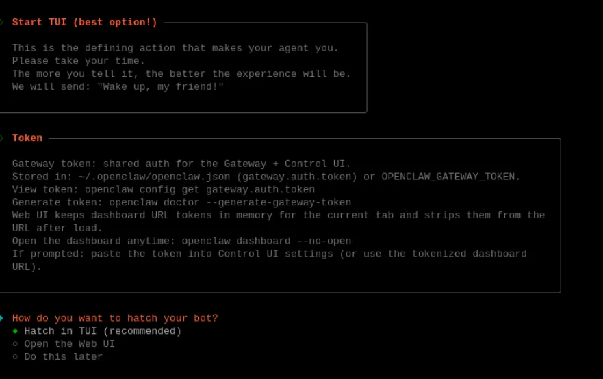 设好模型提供商和API密钥后就是选择模型,因为现在的模型实在太多了,可以先选择模型供应商,然后再选择具体哪一个模型。选完模型后就是配置用那个社交app来给Openclaw的Agent对话,国内的话可以选择飞书,网上应该有很多教程如何使用飞书,这里就不再具体说了。接下来配置网络搜索,这里略过,因为现在的大模型基本上都具备了网络搜索的功能,如果要配置的这个服务的话,需要输入对应服务的API。接下是配置Skill和hook,都选择跳过,这些后面都可以自己再配置。接下来会告诉你web UI的地址和令牌,地址一般都是http://127.0.0.1:18789,这个后续可以在浏览器中打开查看。另外有个网关的令牌(token)非常重要,可以先记下来,后续也可以在配置文件中找到。接下来会启动TUI,就是Openclaw的文本对话界面。系统会建议在此界面中孵化龙虾。龙虾的孵化界面,从这里开始就是要接入大模型,开始算token了。第一个问题:Hey, I just came online, Who am I? who are you?这是一个默认的问题,通过这个问题,你可以让龙虾的Agent,这里是main agent,知道它叫什么名字,它该怎么称呼你,行为方式如何。也可以在社交app上跟它打招呼,这里以telegram为例,第一次打招呼后它会提供一个配对码,然后就可以接入了。
