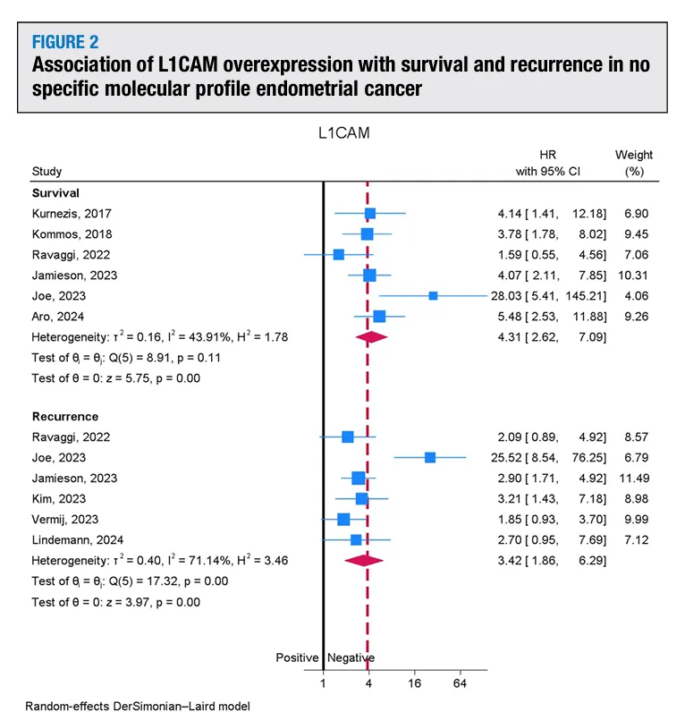 L1CAM过表达是复发强预测因素,合并HR=3.42(P<.001),提示L1CAM阳性的NSMP患者复发风险超过3倍;