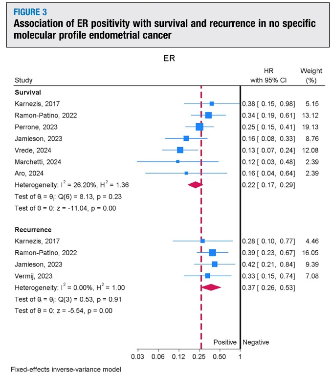 该森林图显示 ER 阳性患者在生存和复发方面均较 ER 阴性者具有更佳预后(HR<1),并汇总了各研究及总体固定效应合并分析的 HR 与异质性指标。