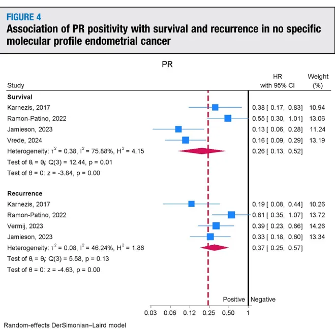 森林图显示 PR 阳性患者比 PR 阴性者具有显著更好的生存和更低复发风险(HR<1),并整合了各研究的合并 HR 与异质性指标。