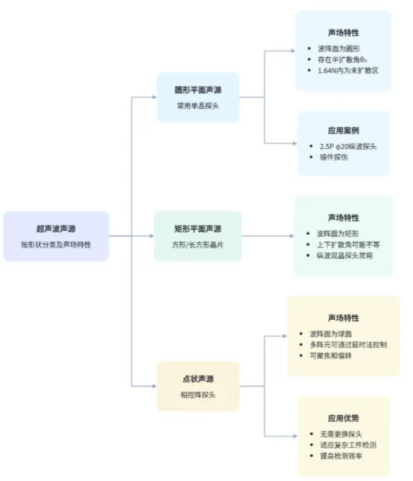 平面矩形声源:方形或长方形的平面矩形声源向外发射超声波,存在上下扩散角,若垂直发射,波阵面为方形。实际探伤中,纵波双晶探头常用方形镜片。